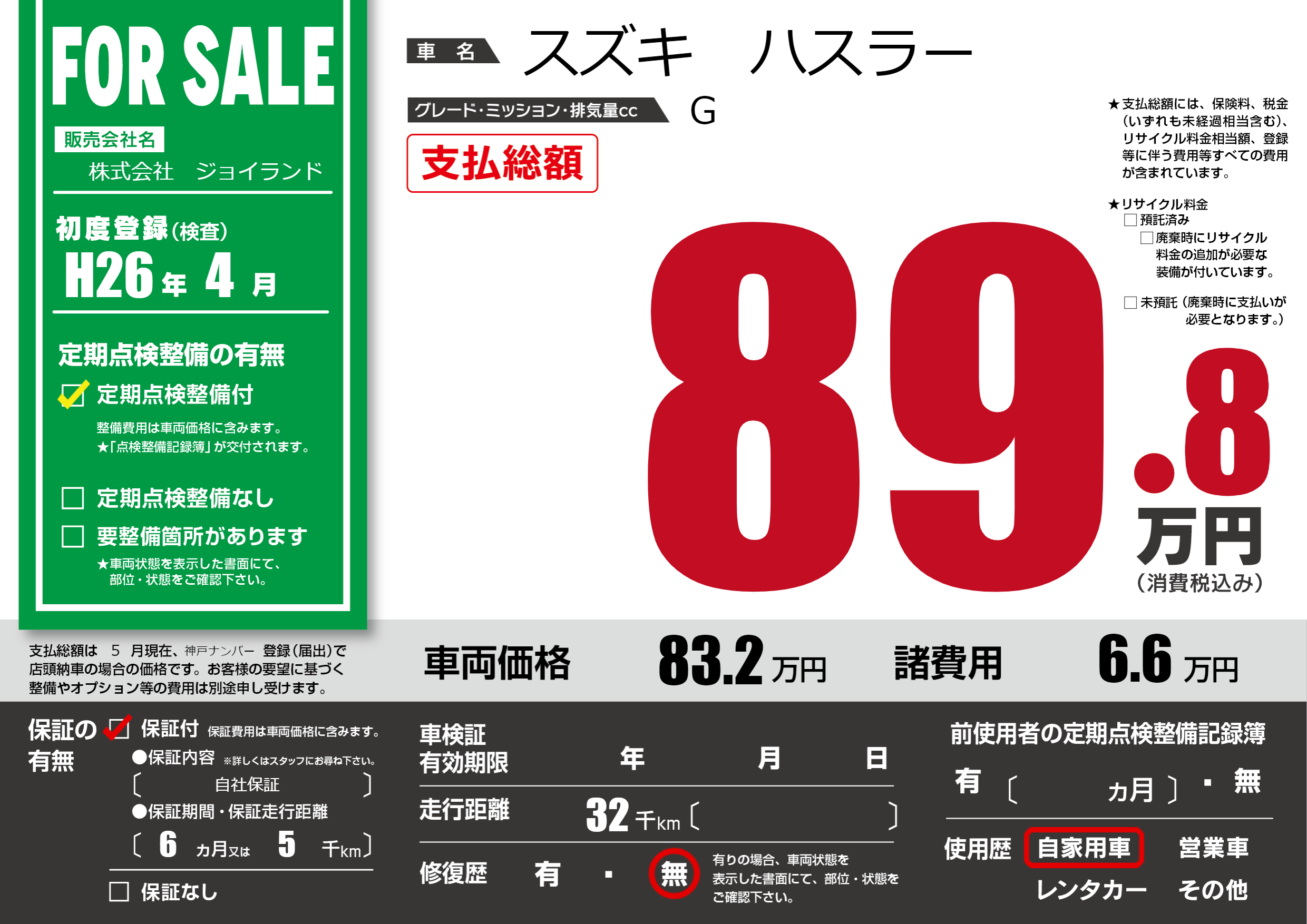 | 車名 | スズキ ハスラー | グレード ミッション 排気量 |