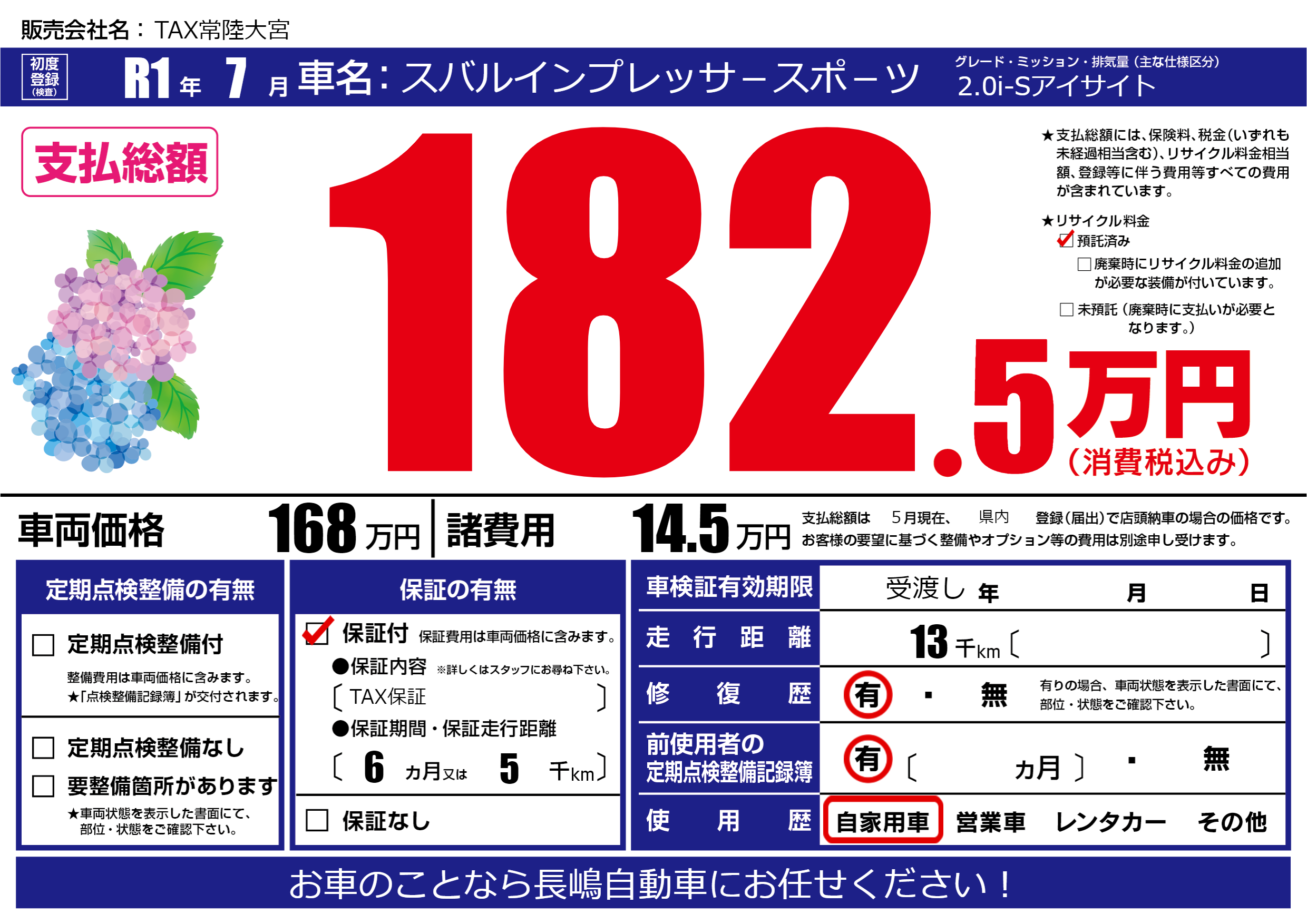 保証付き 保証内容(TAX保証) 6ヶ月または(5)千kmまで |