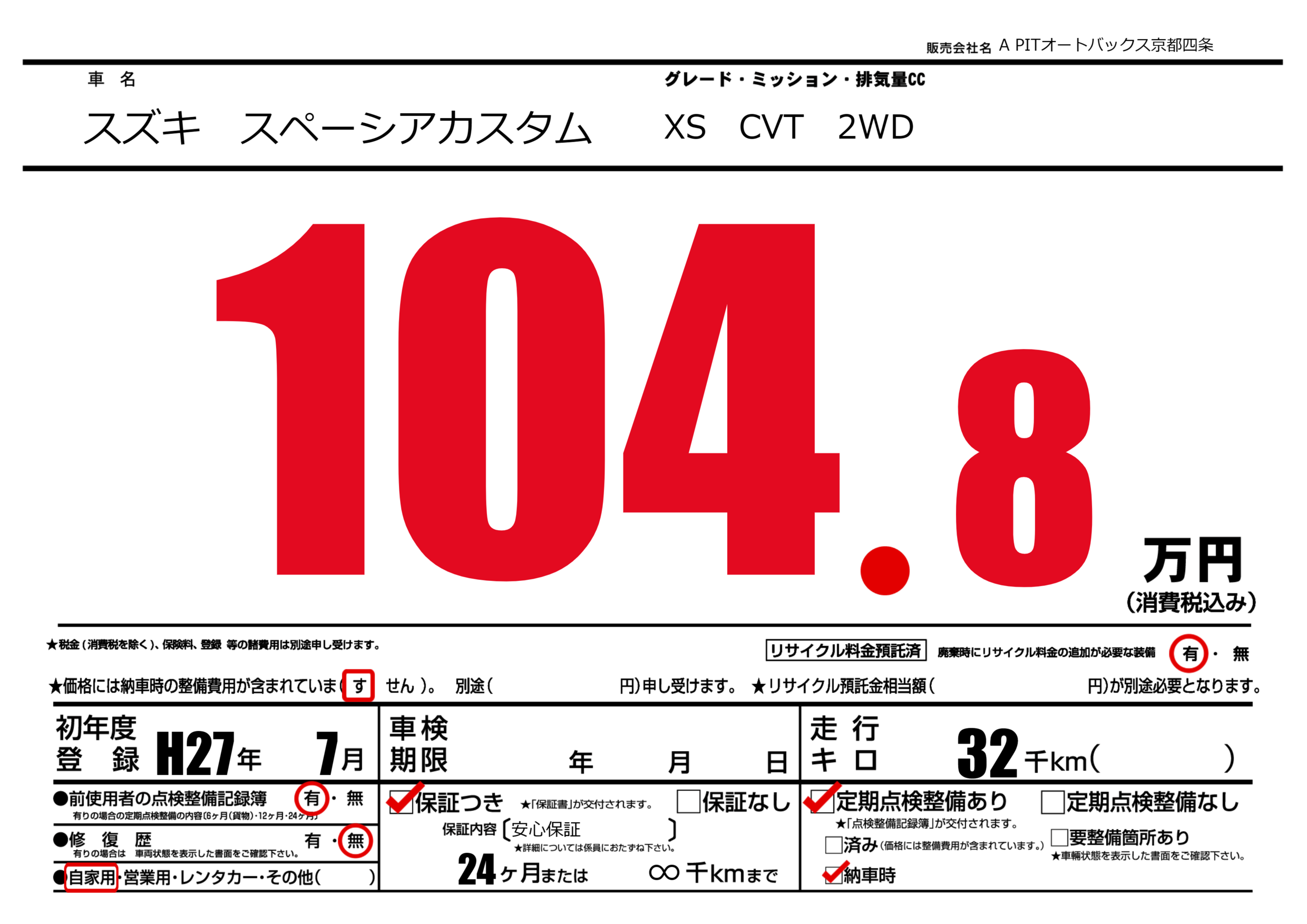 | 定期点検整備 | 定期点検整備あり 納車時あり | ||