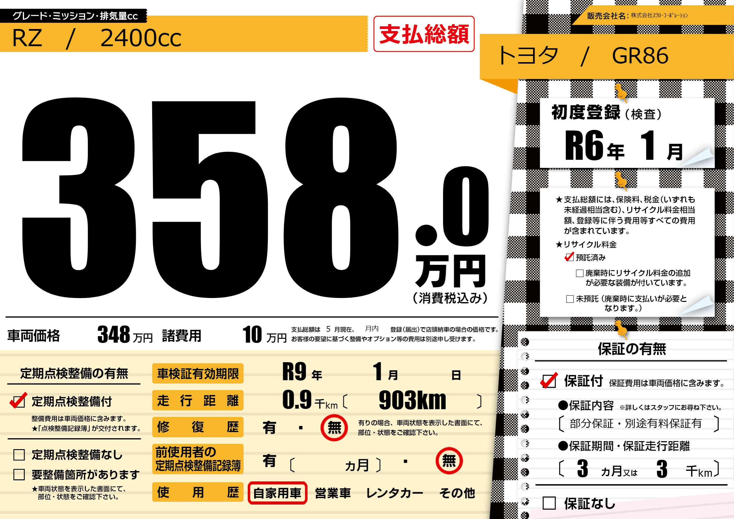 | 車名 | トヨタ / GR86 | グレード ミッション 排気量 |