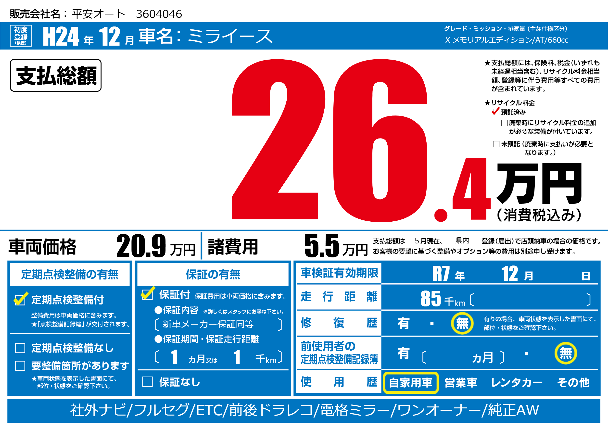 | 走行キロ | 8.5万km | 初年度登録 | H24年12月 |