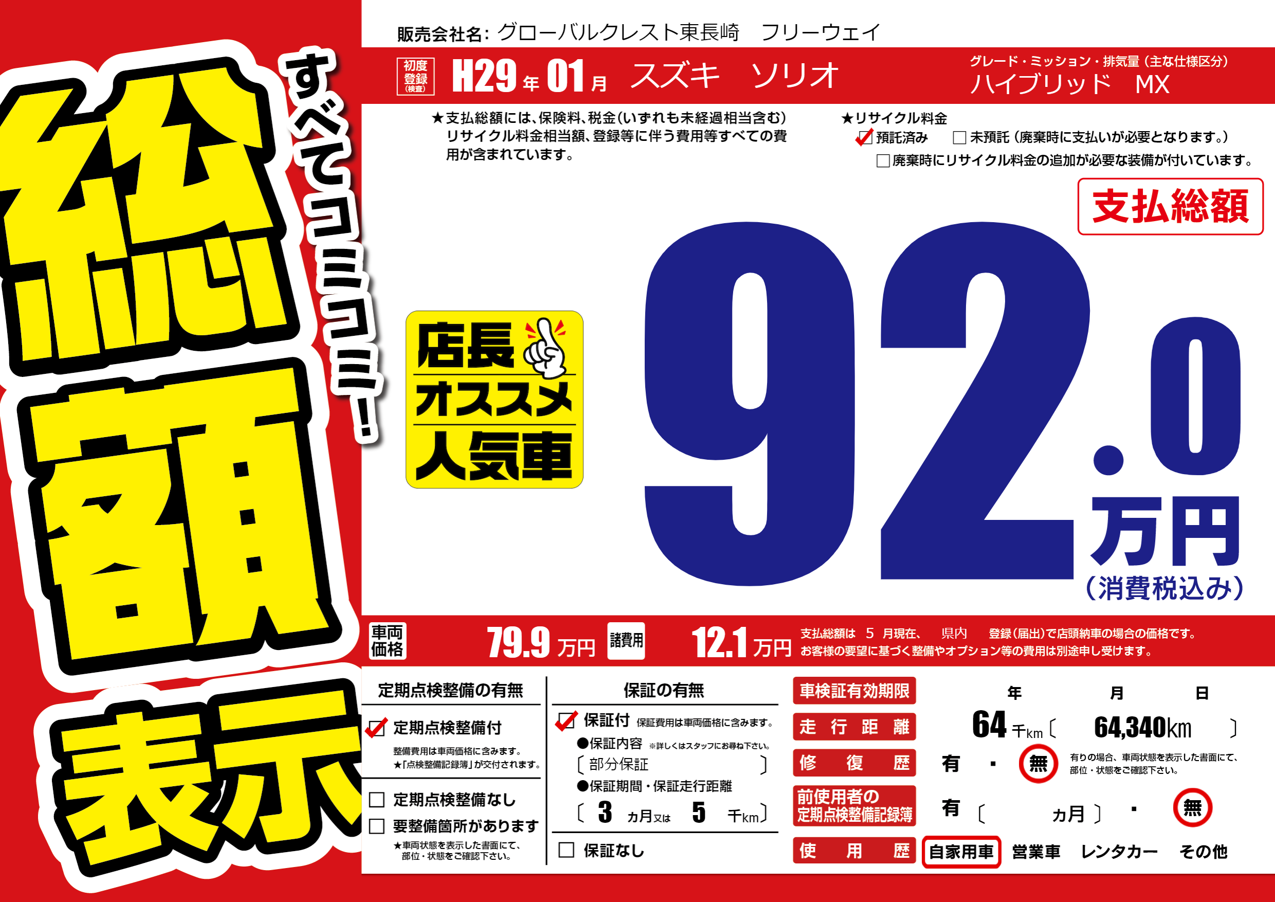 | 車名 | スズキ ソリオ | グレード ミッション 排気量 |