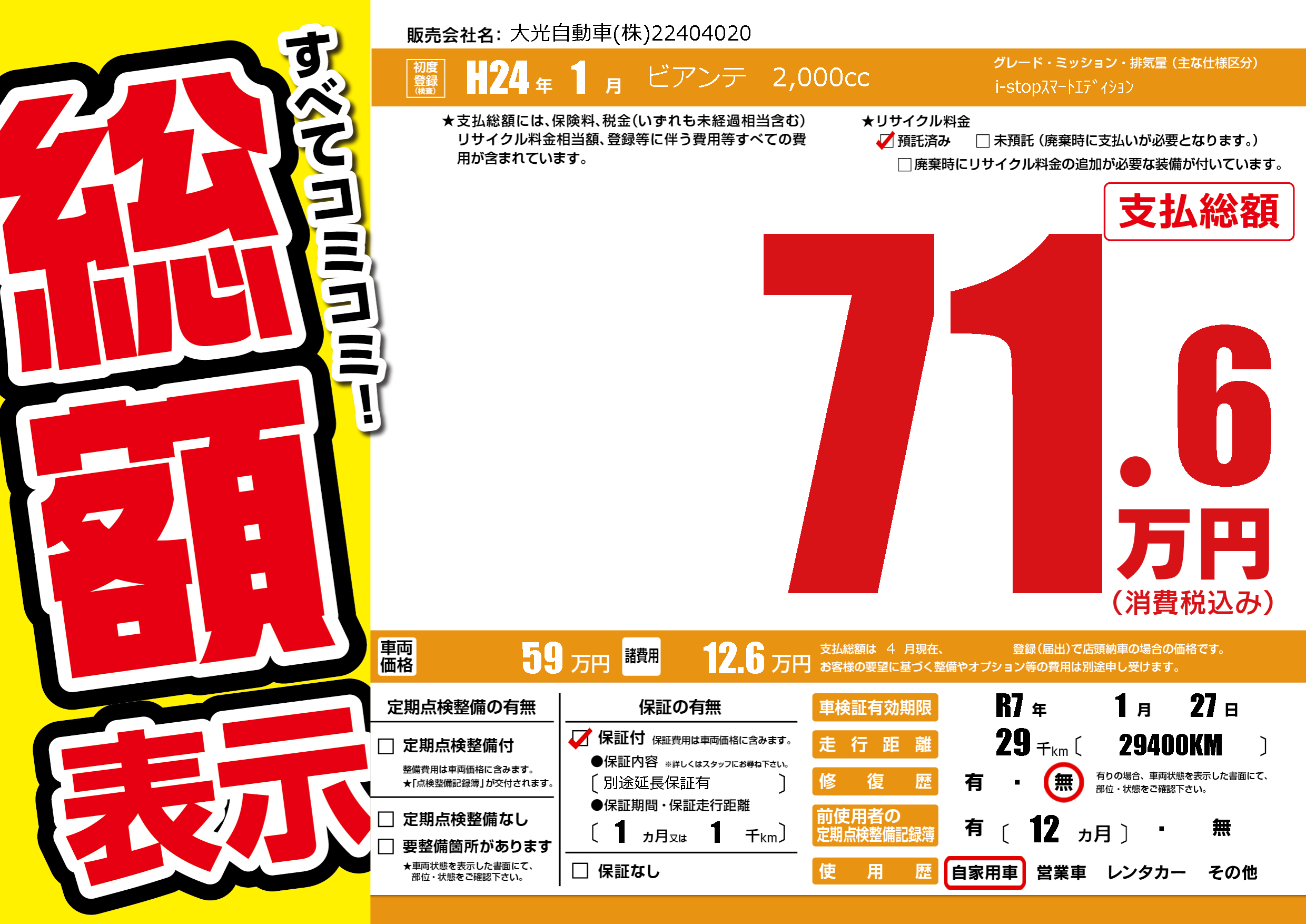 | 車名 | ビアンテ 2,000cc | グレード ミッション 排気量 |