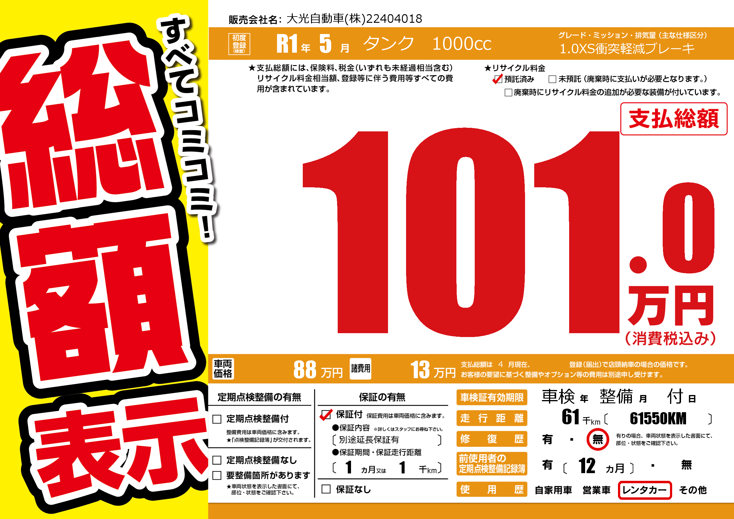 | 車名 | タンク 1000cc | グレード ミッション 排気量 |