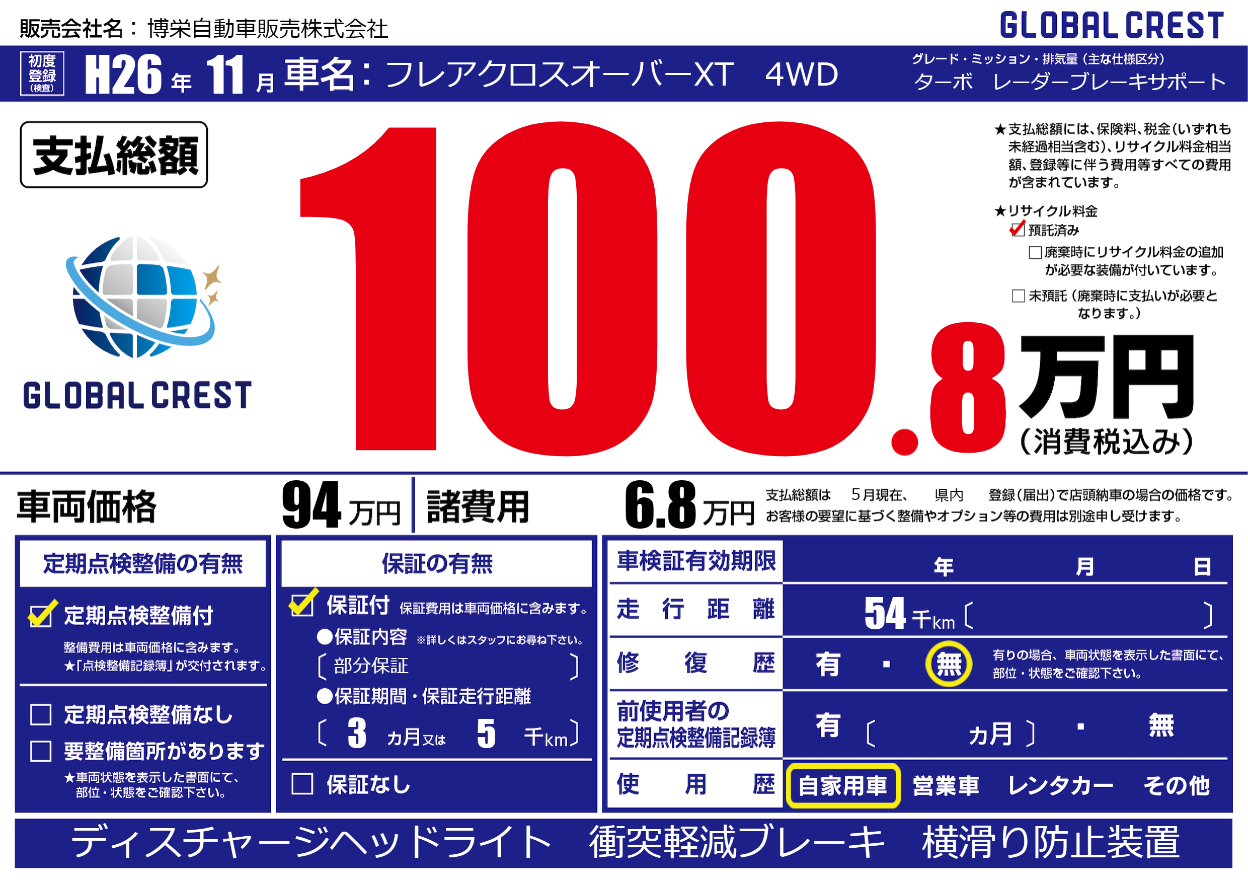 | 車名 | フレアクロスオーバーXT 4WD | グレード ミッション 排気量 |