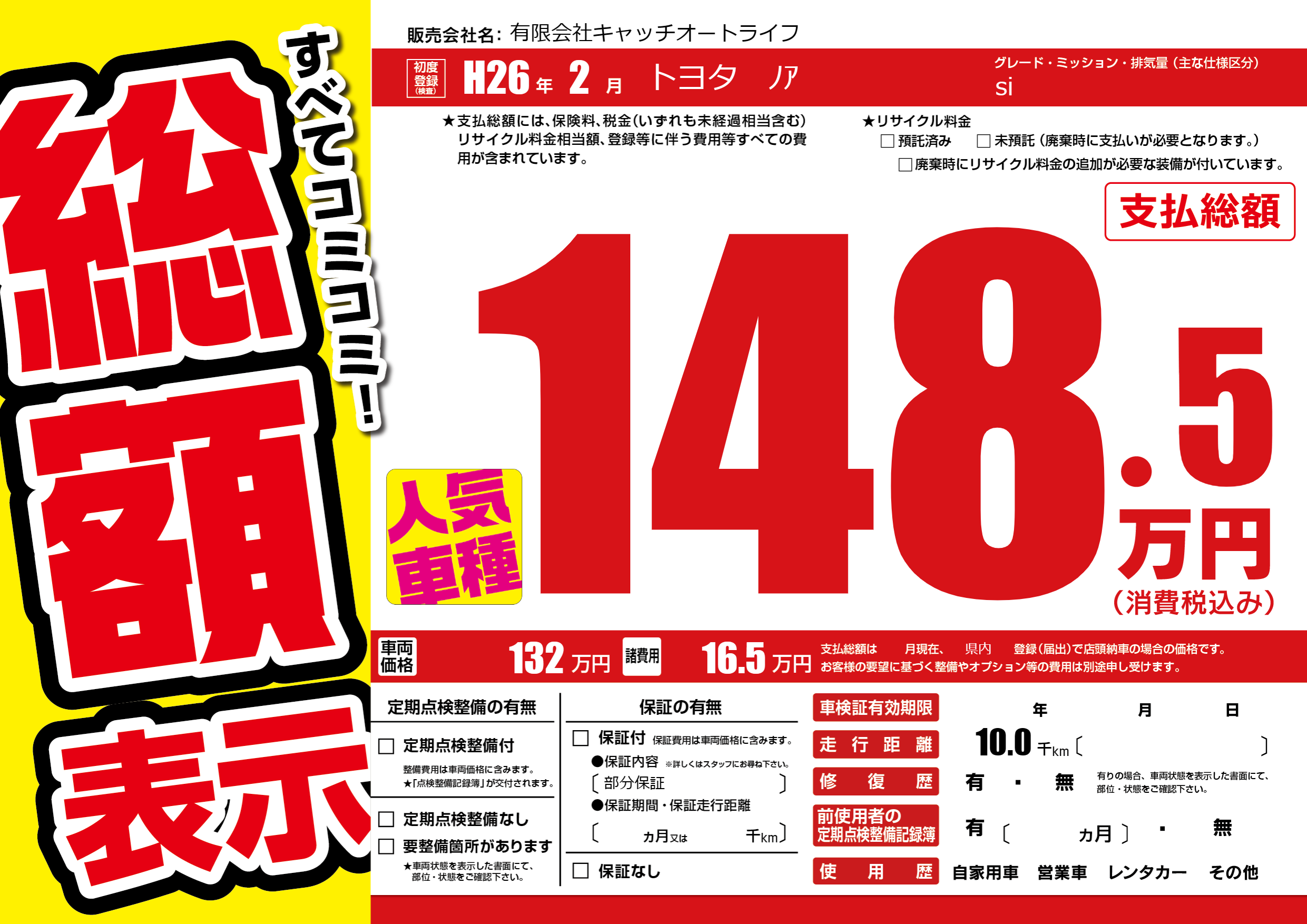 | 走行キロ | 1万km | 初年度登録 | H26年2月 |