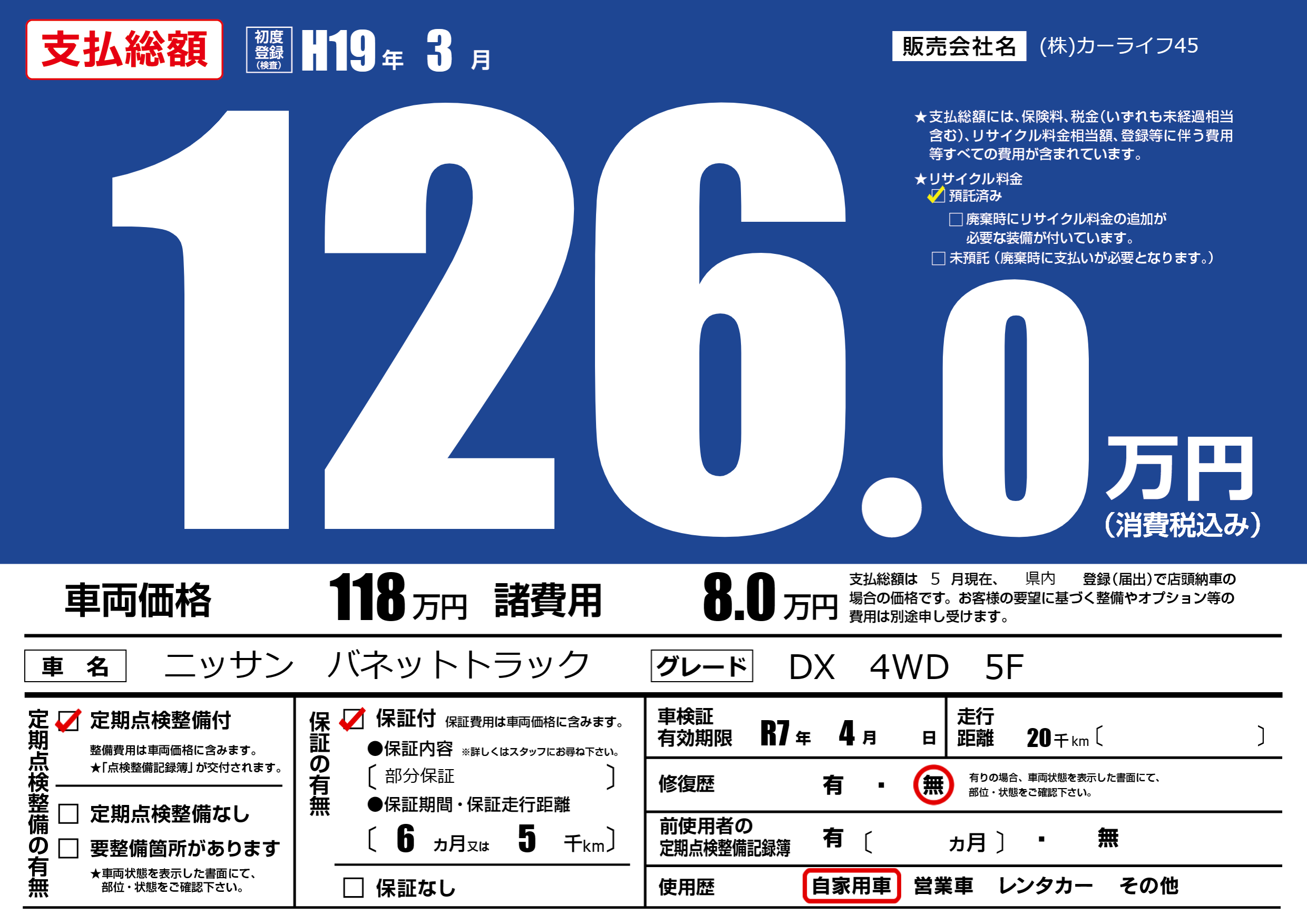 | 車名 | ニッサン バネットトラック | グレード ミッション 排気量 |