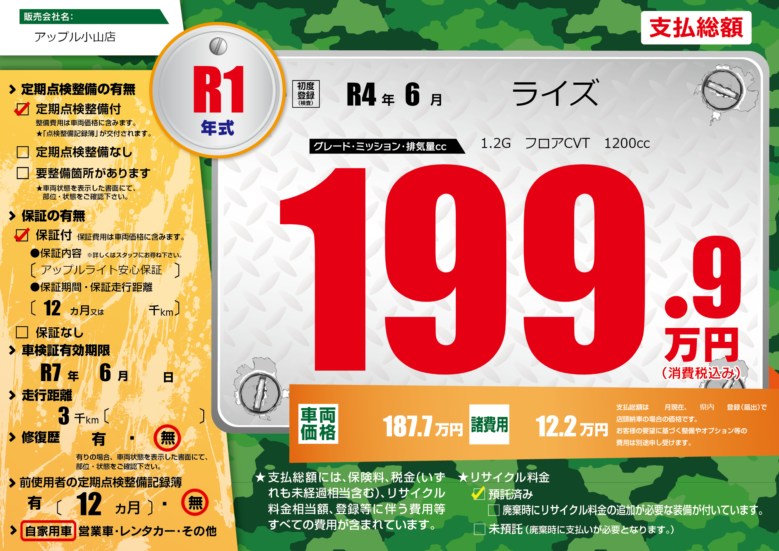 | 走行キロ | 0.3万km | 初年度登録 | R4年6月 |