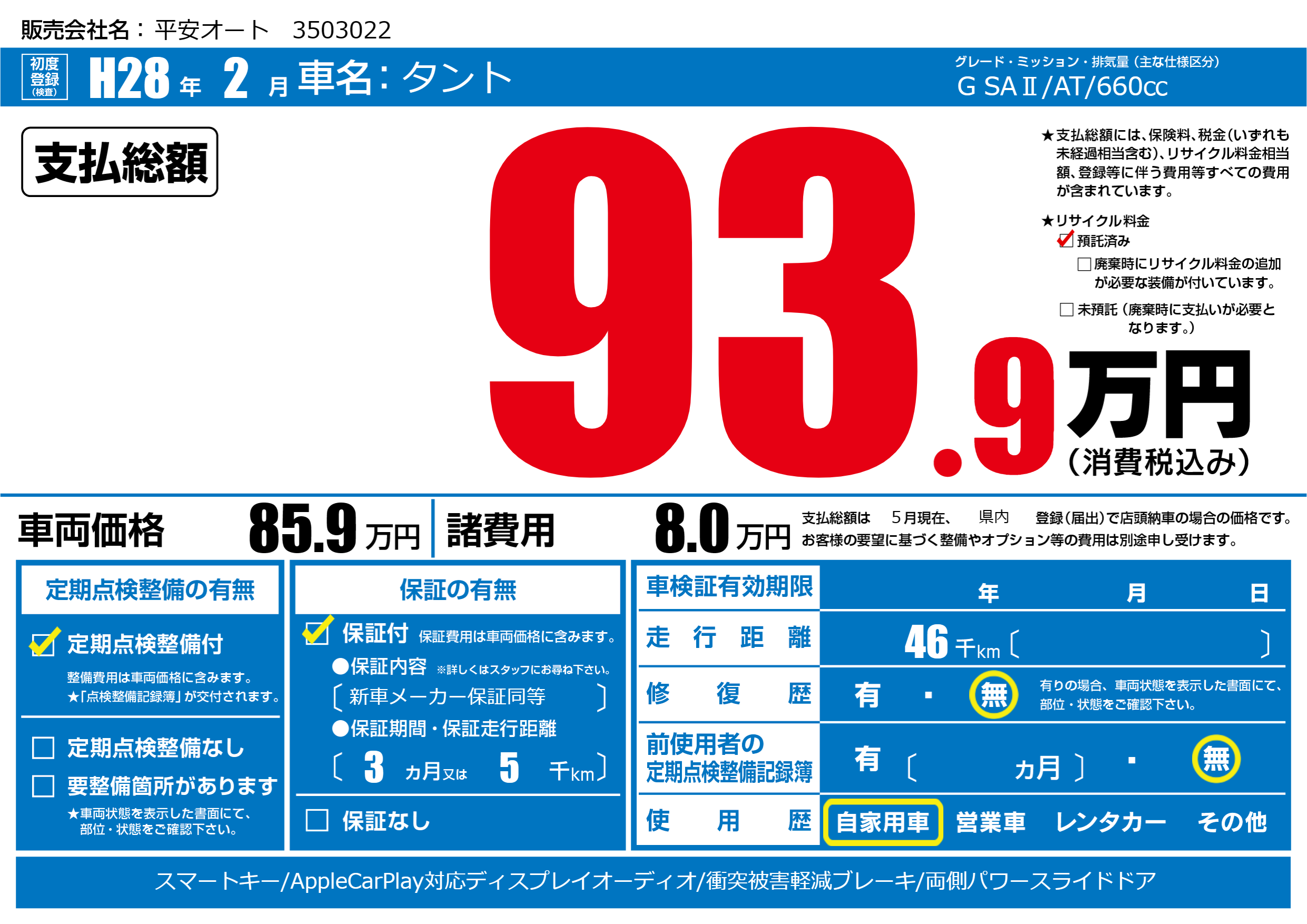 保証付き 保証内容(新車メーカー保証同等) 3ヶ月または(5)千kmまで |