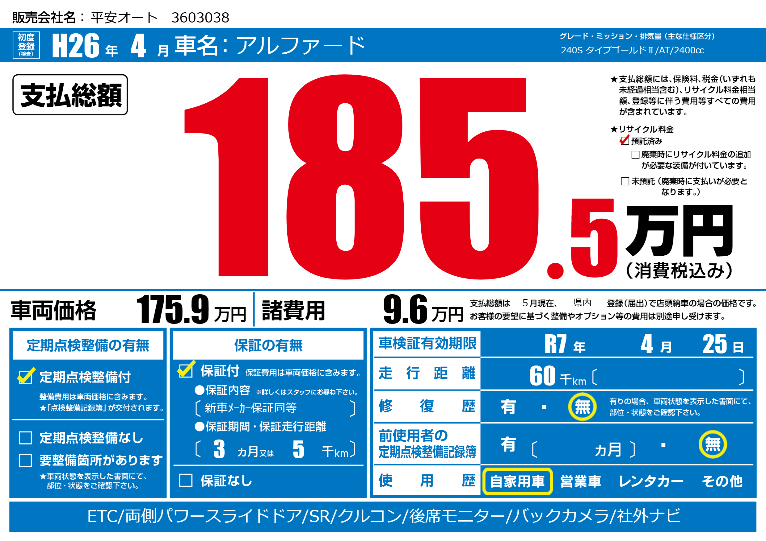 | 車名 | アルファード | グレード ミッション 排気量 |