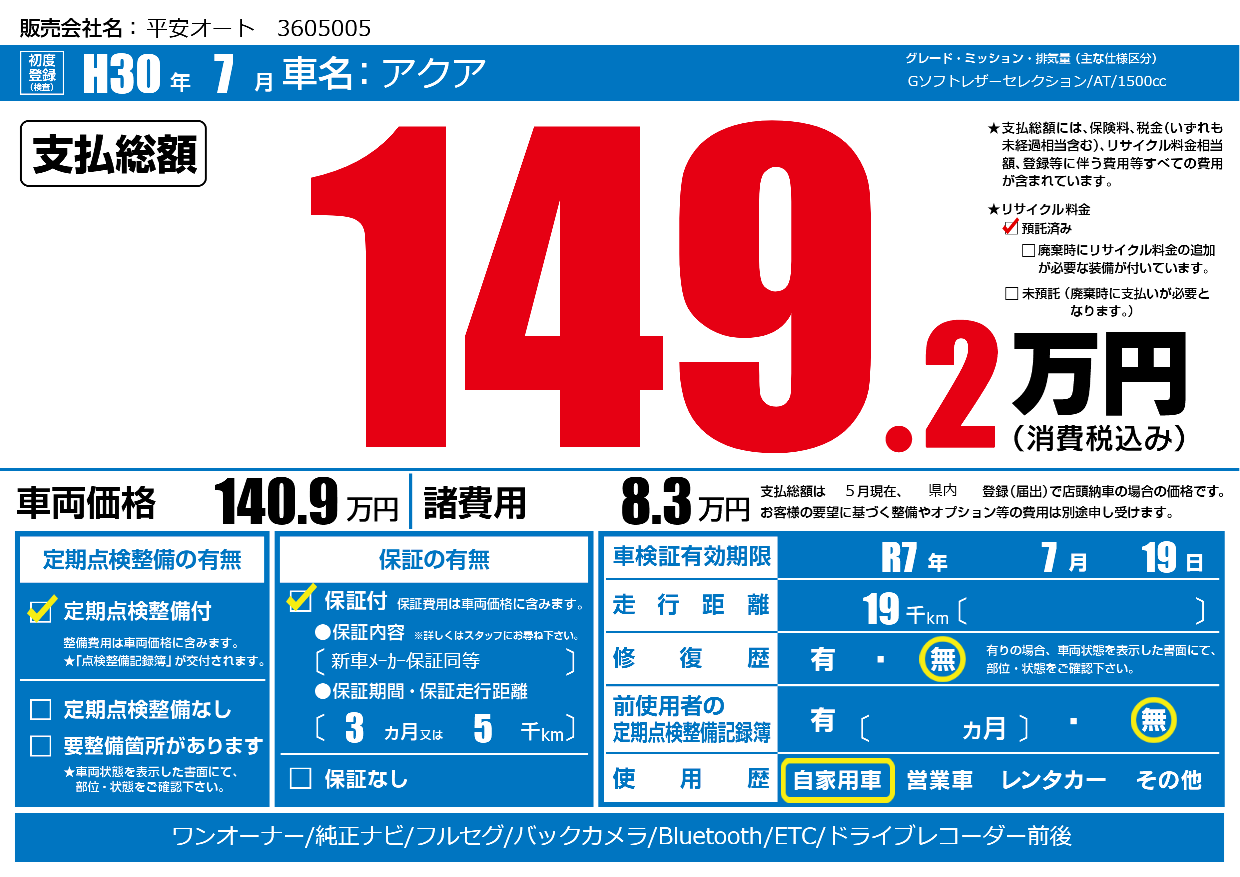 | 車検制限 | R7年 7月 19日 | ||