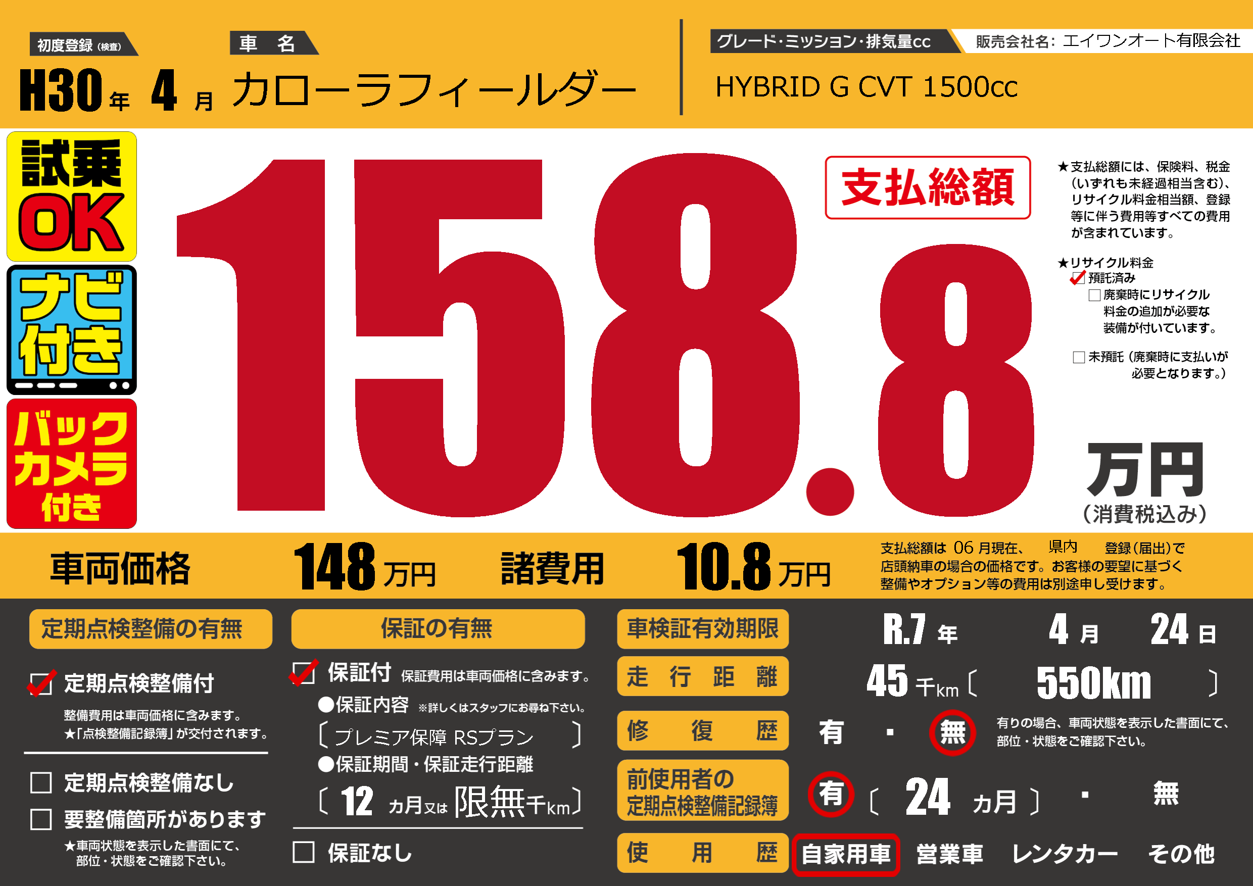 | 走行キロ | 4.5万km | 初年度登録 | H30年4月 |