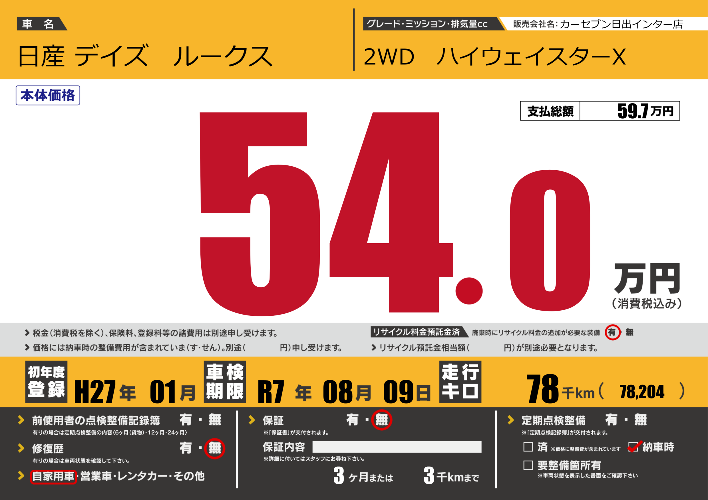 なし | 車検制限 | R7年08月09月 |