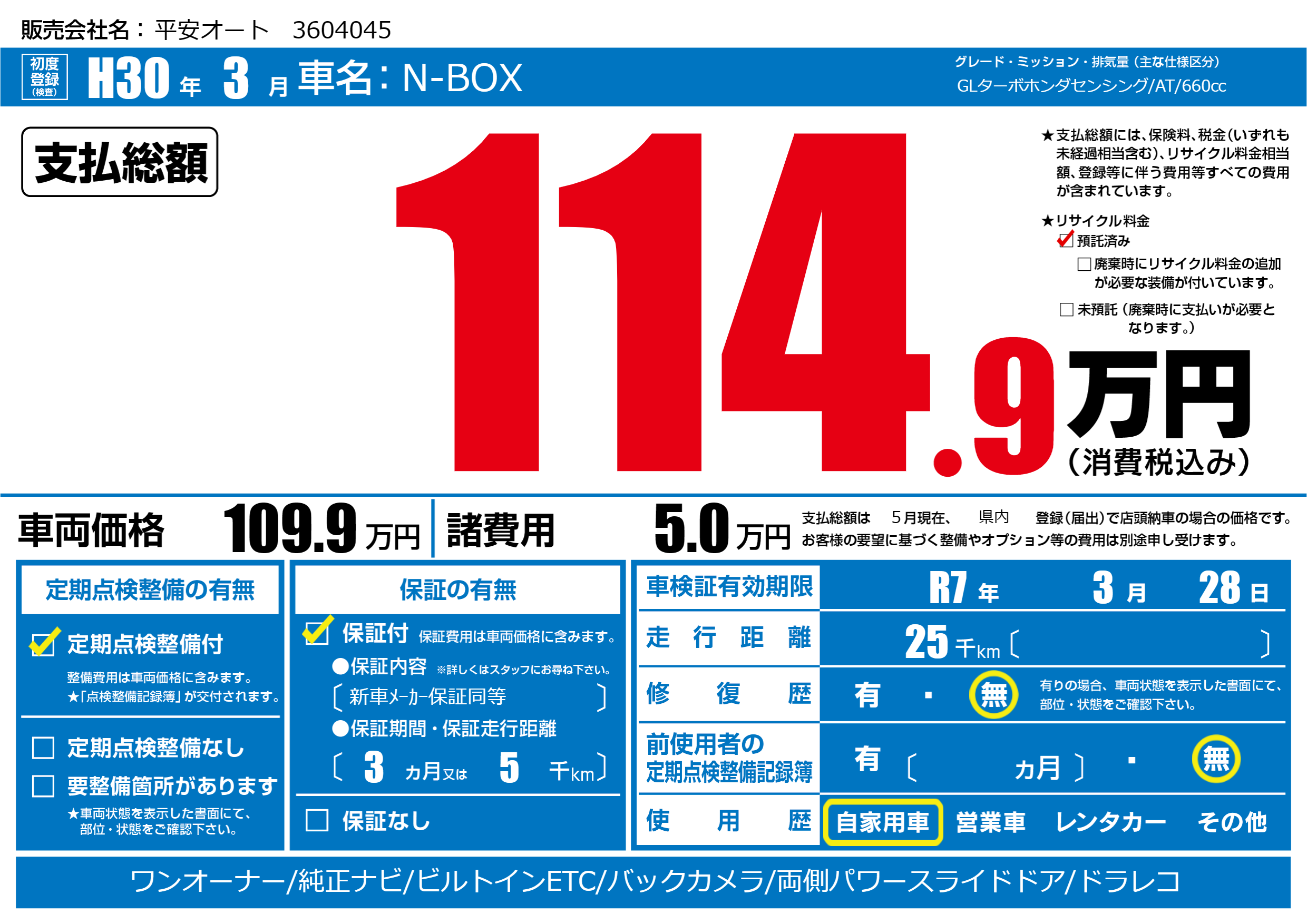 | 走行キロ | 2.5万km | 初年度登録 | H30年3月 |