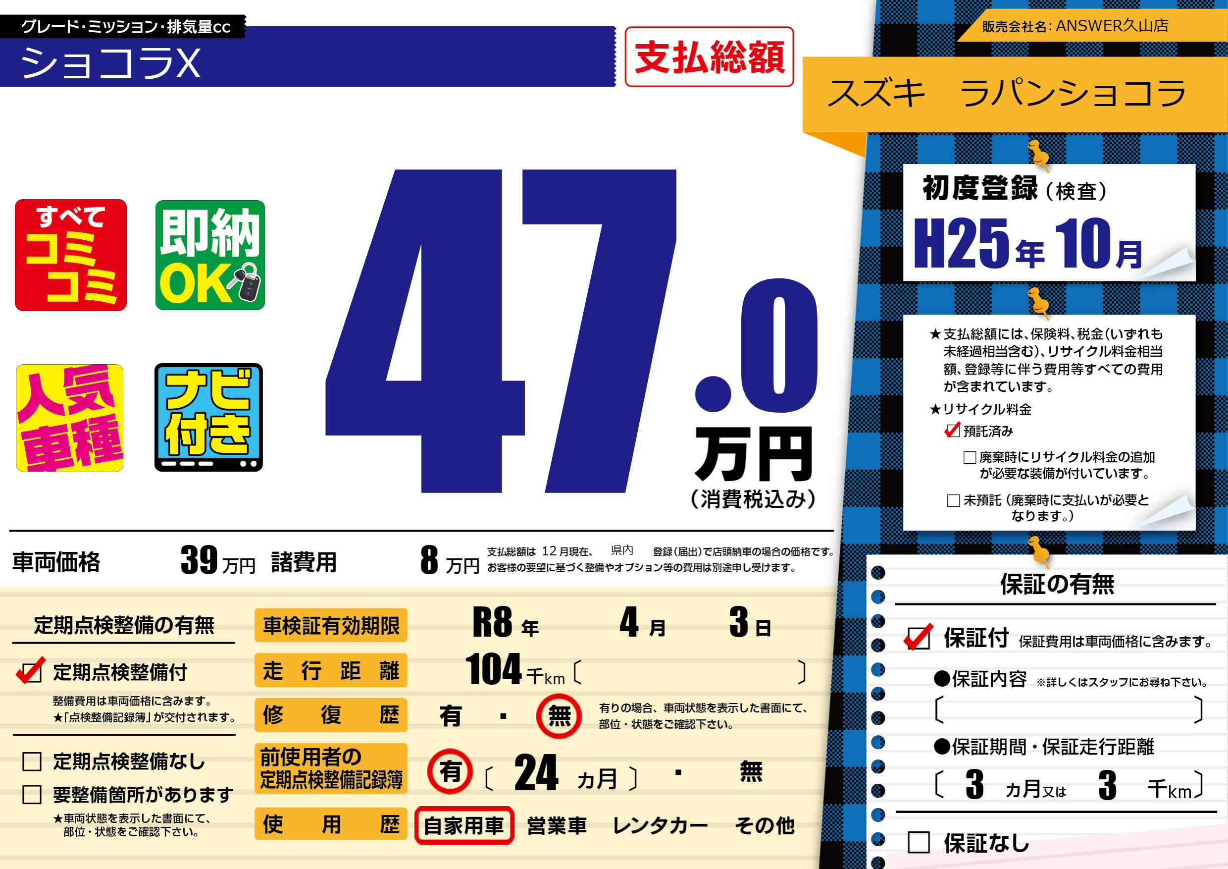 | 走行キロ | 10.4万km | 初年度登録 | H25年10月 |