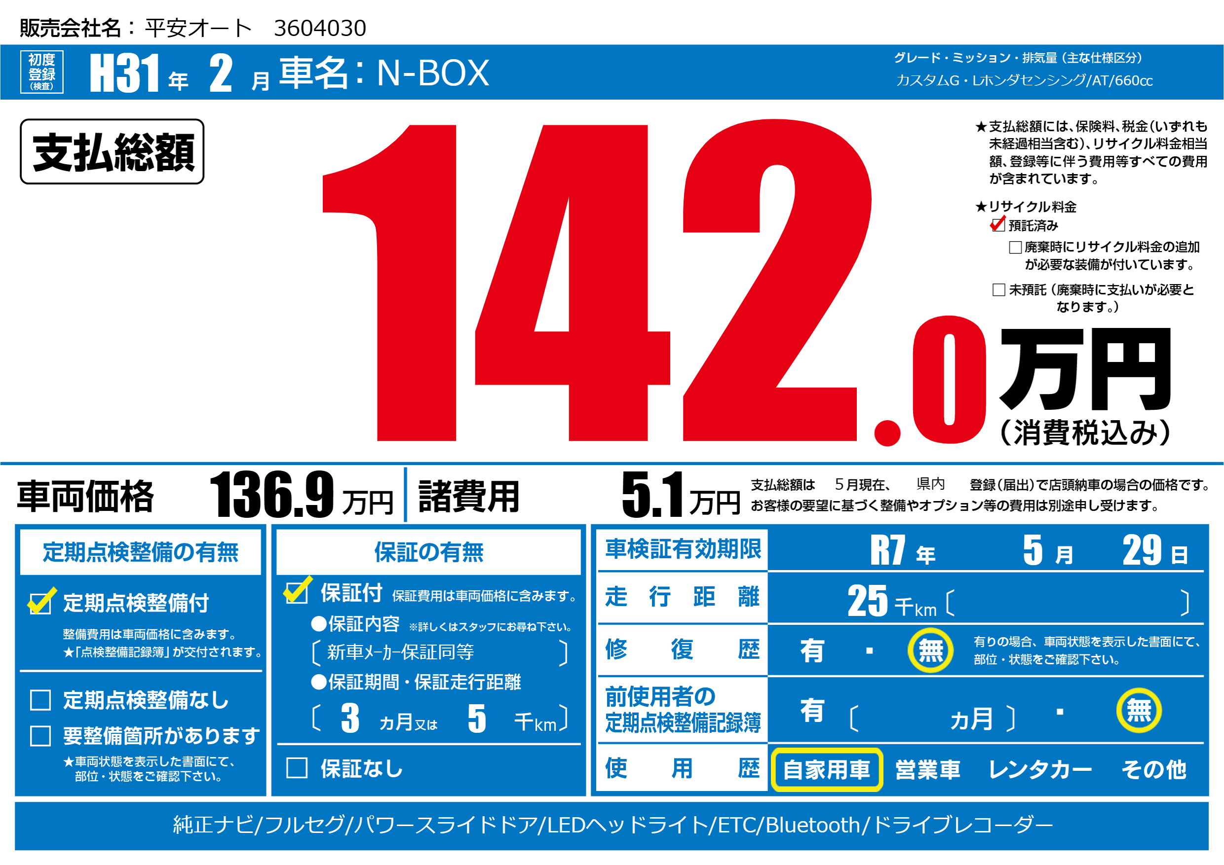 | 車検制限 | R7年 5月 29日 | ||
