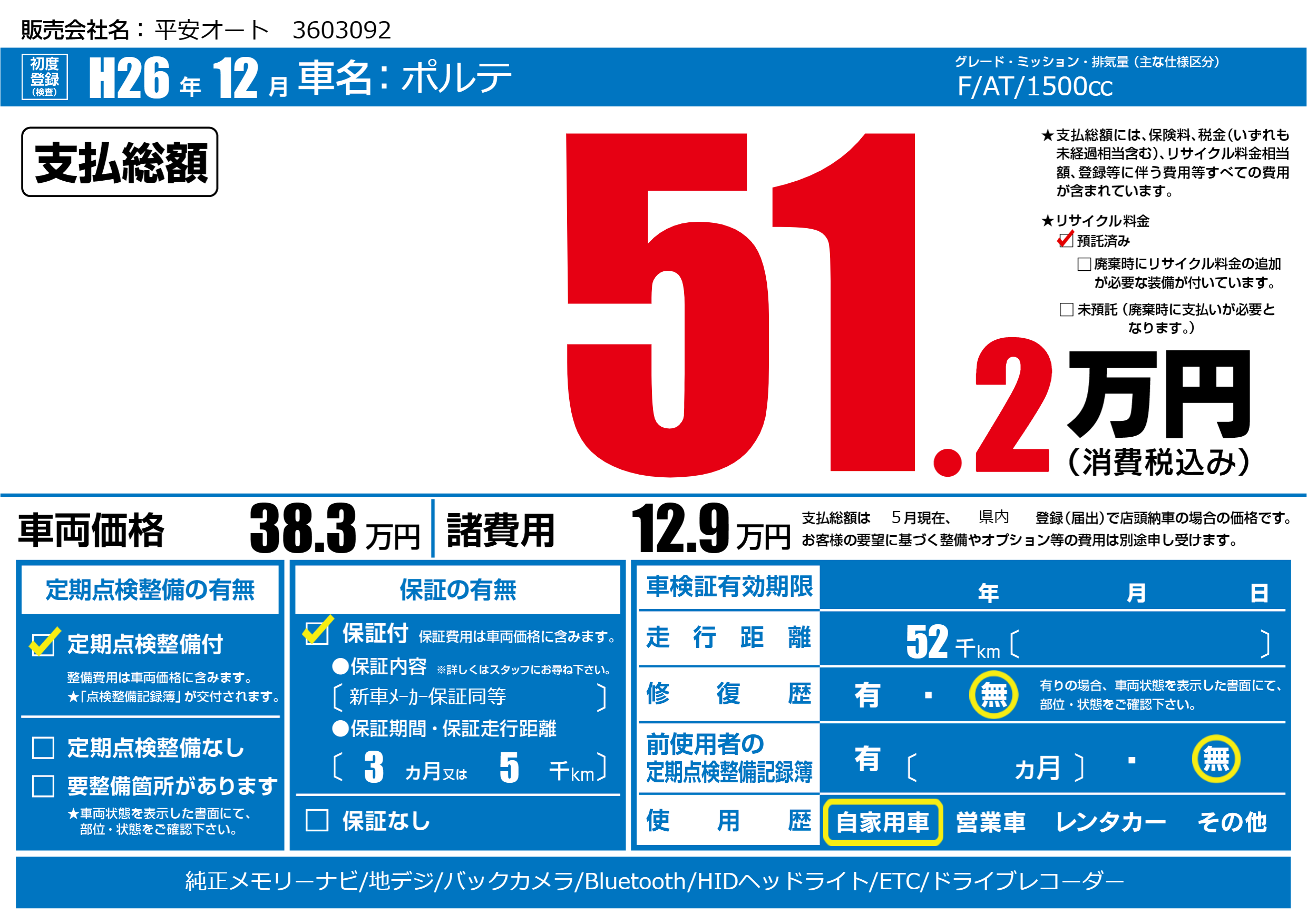 | 車名 | ポルテ | グレード ミッション 排気量 |