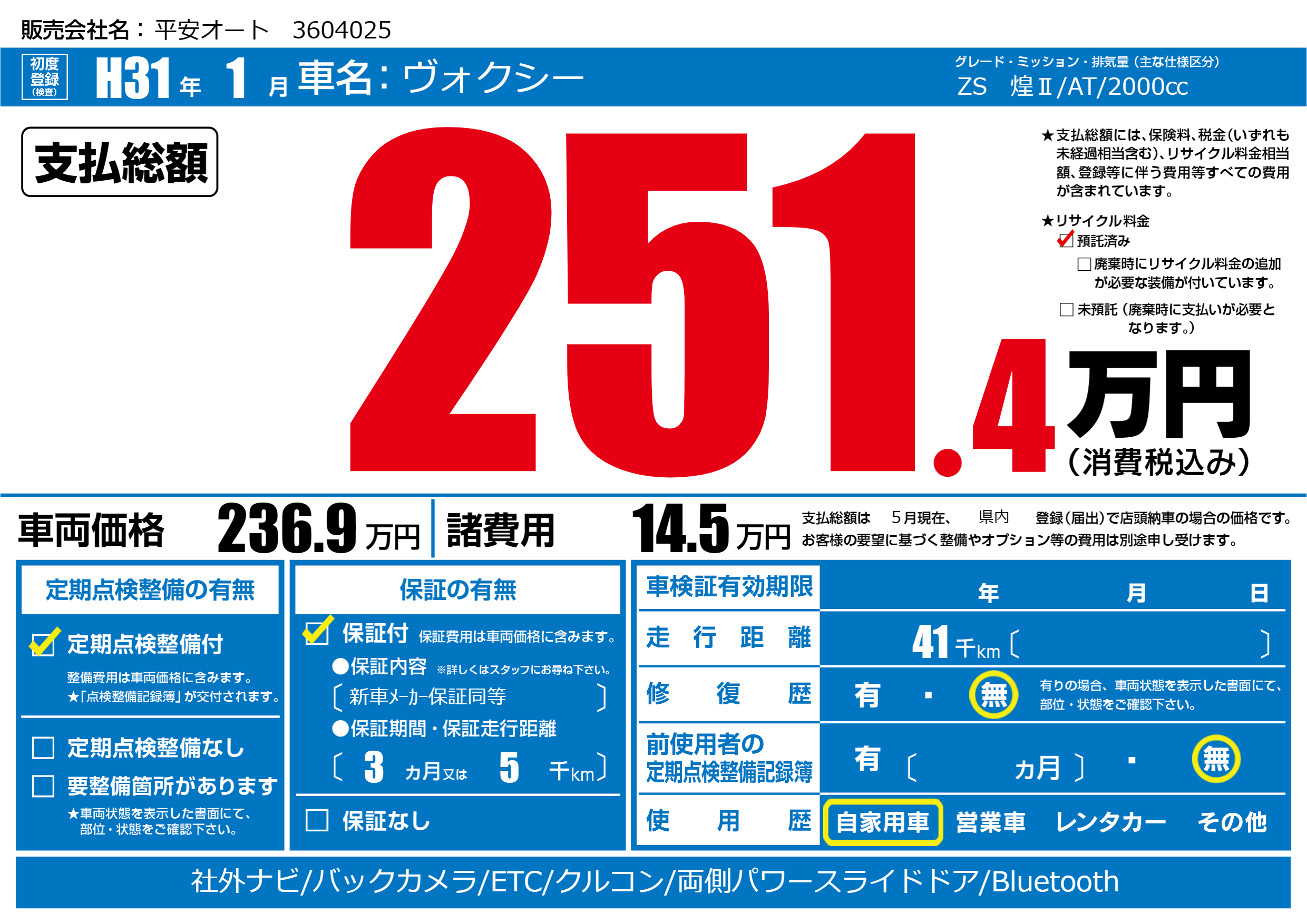 | 車名 | ヴォクシー | グレード ミッション 排気量 |