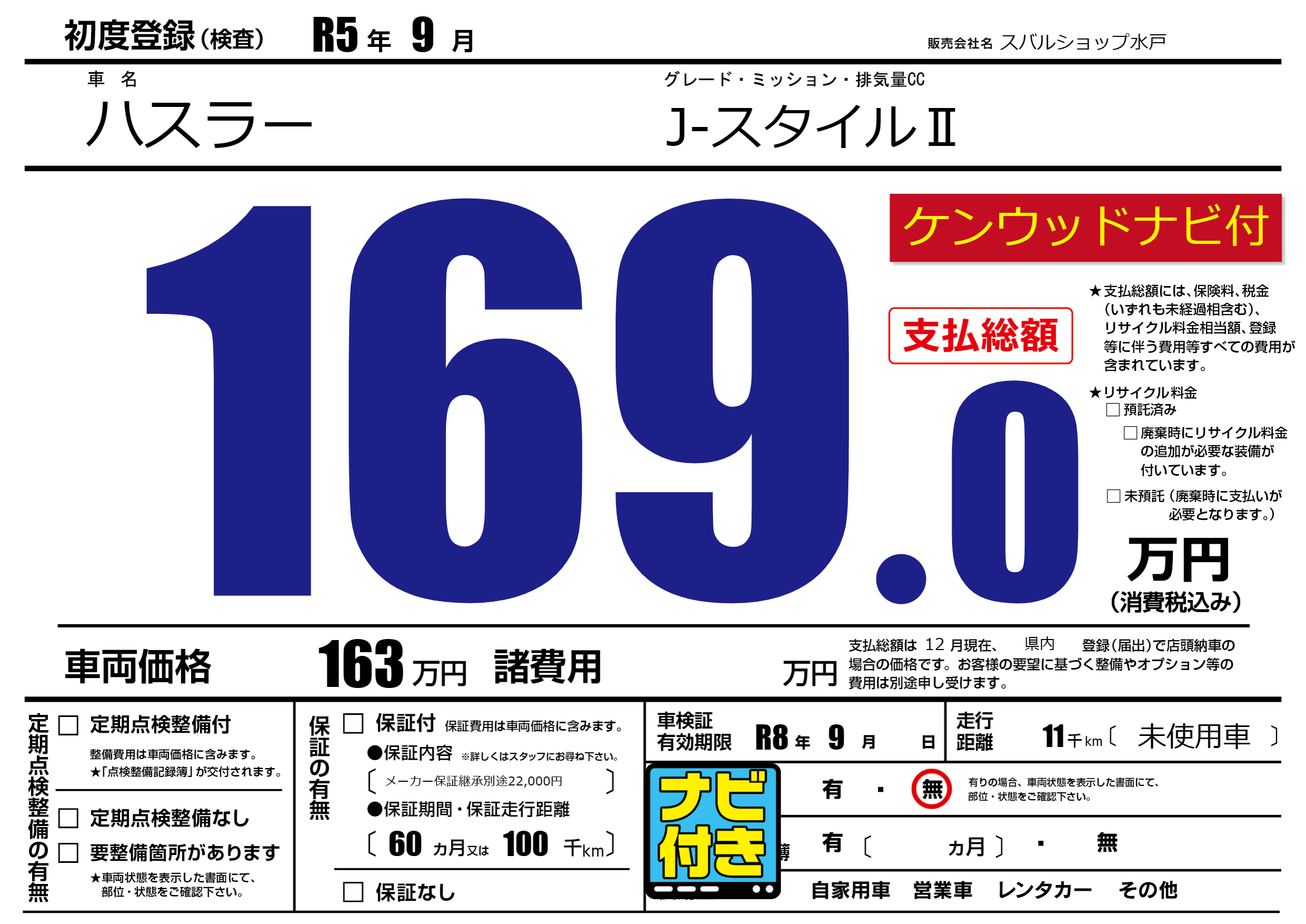 | 走行キロ | 1.1万km | 初年度登録 | R5年9月 |