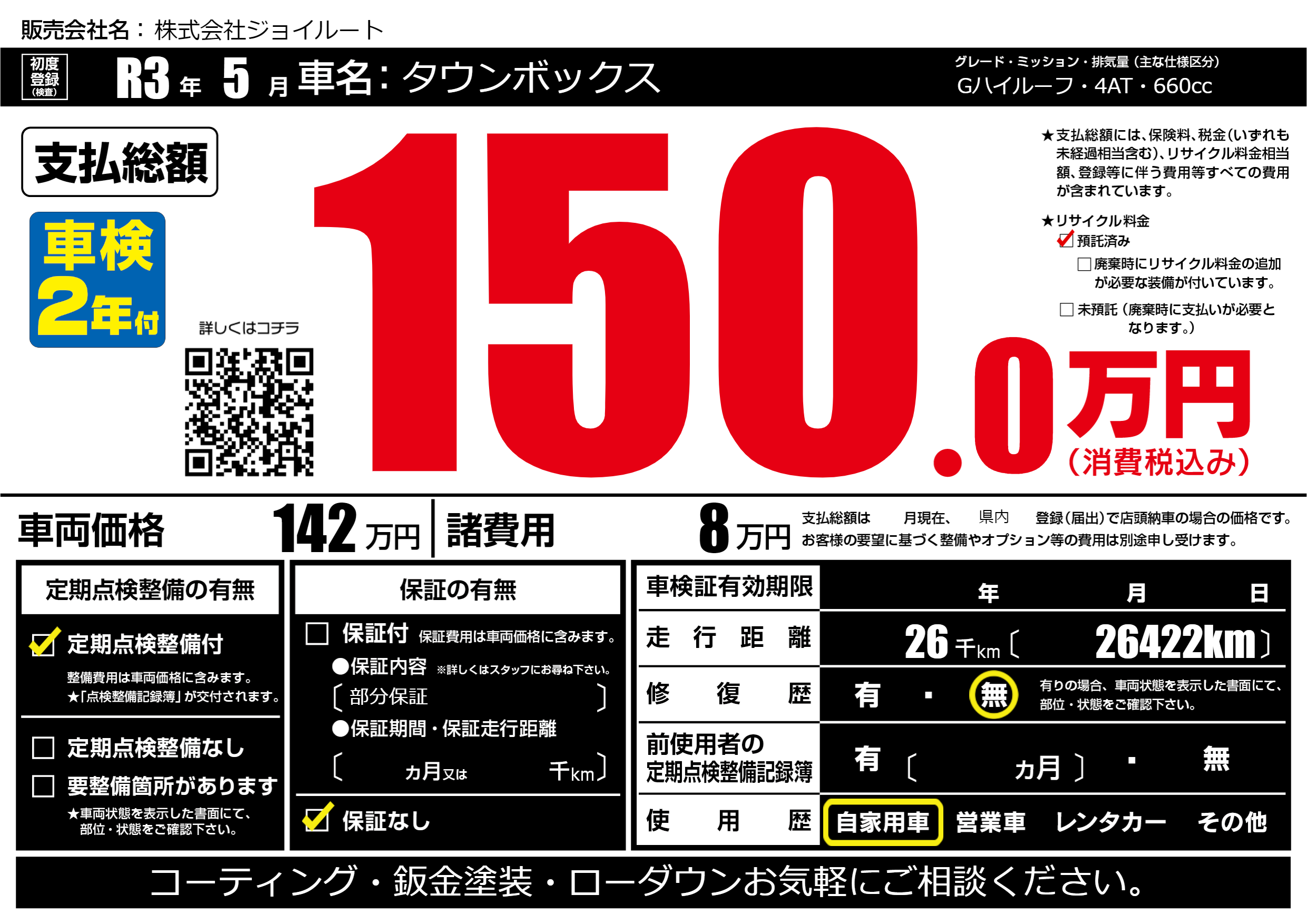 | 走行キロ | 2.6万km | 初年度登録 | R3年5月 |