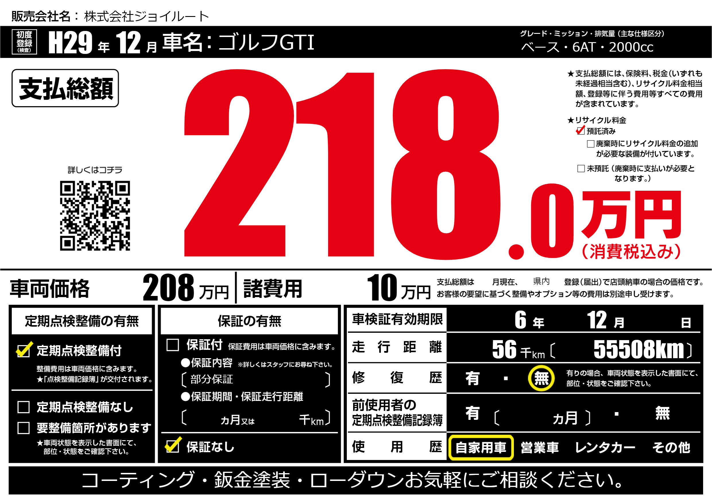 | 車名 | ゴルフGTI | グレード ミッション 排気量 |