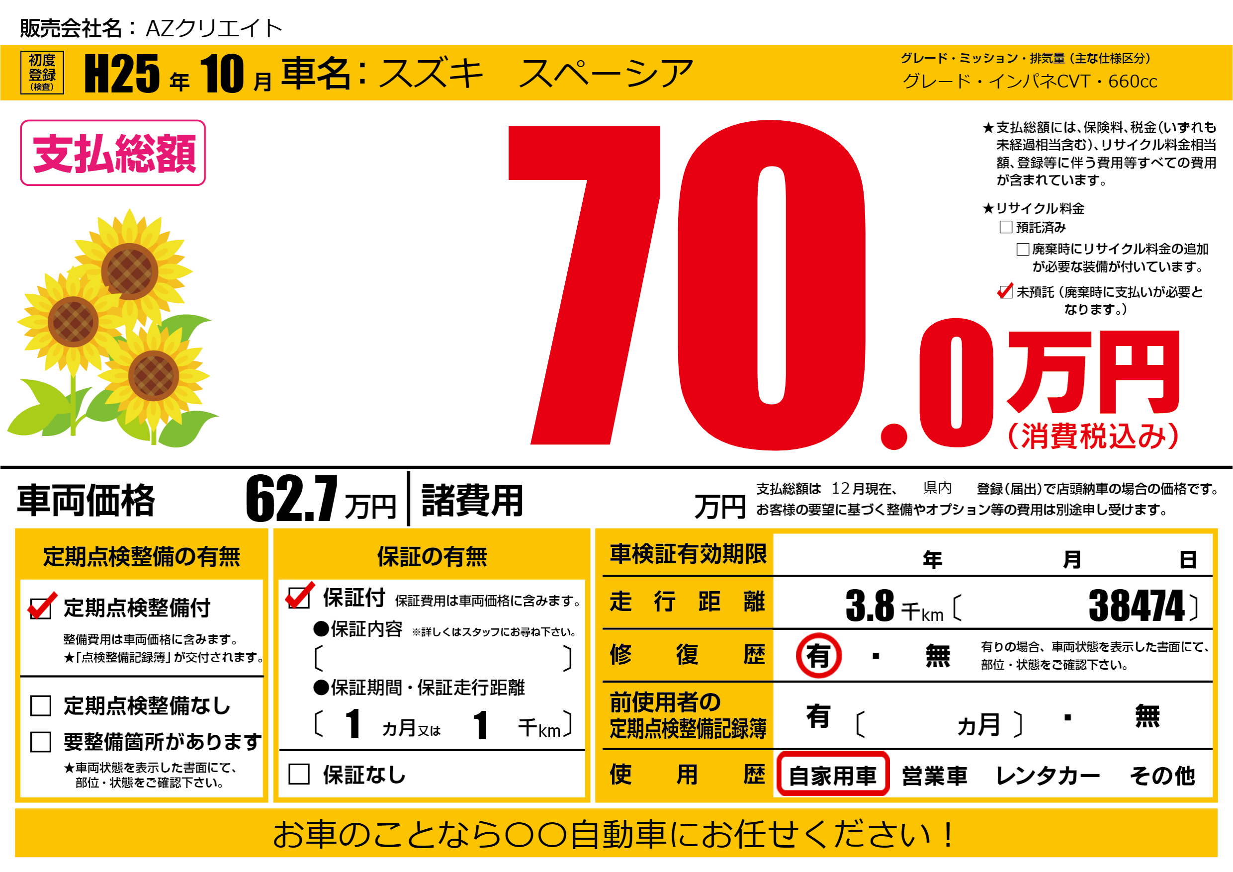 | 走行キロ | 0.3万km | 初年度登録 | H25年10月 |