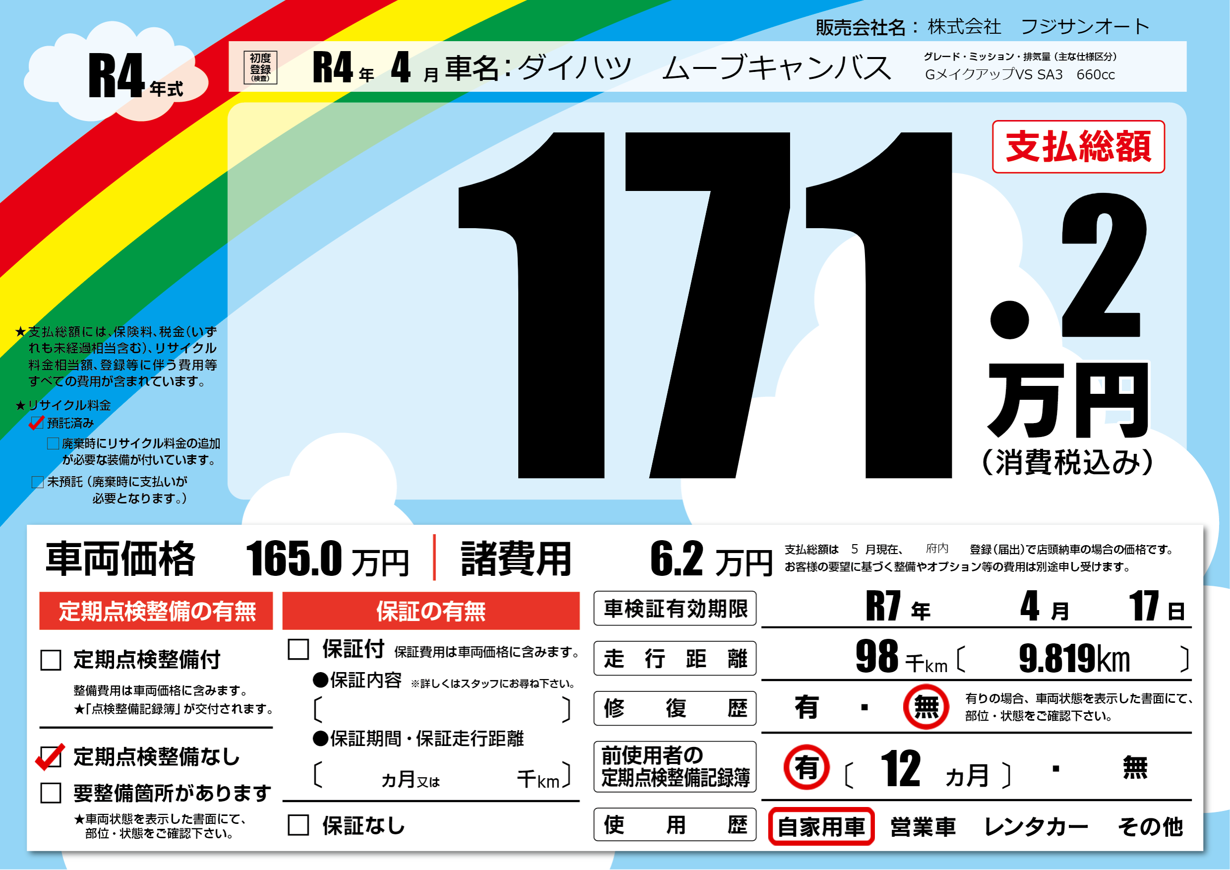 | 走行キロ | 9.8万km | 初年度登録 | R4年4月 |