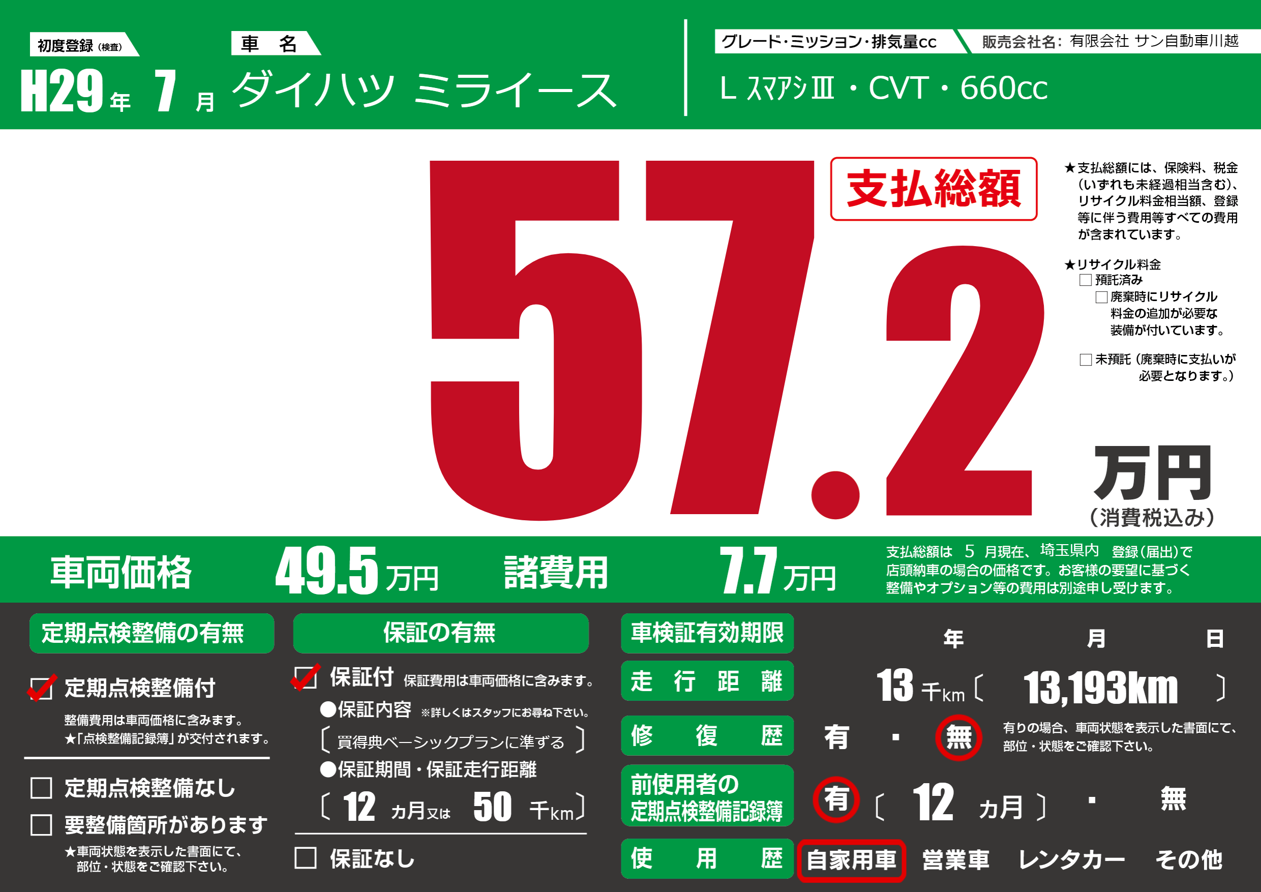 保証付き 保証内容(買得典ベーシックプランに準ずる) 12ヶ月または(50)千kmまで |