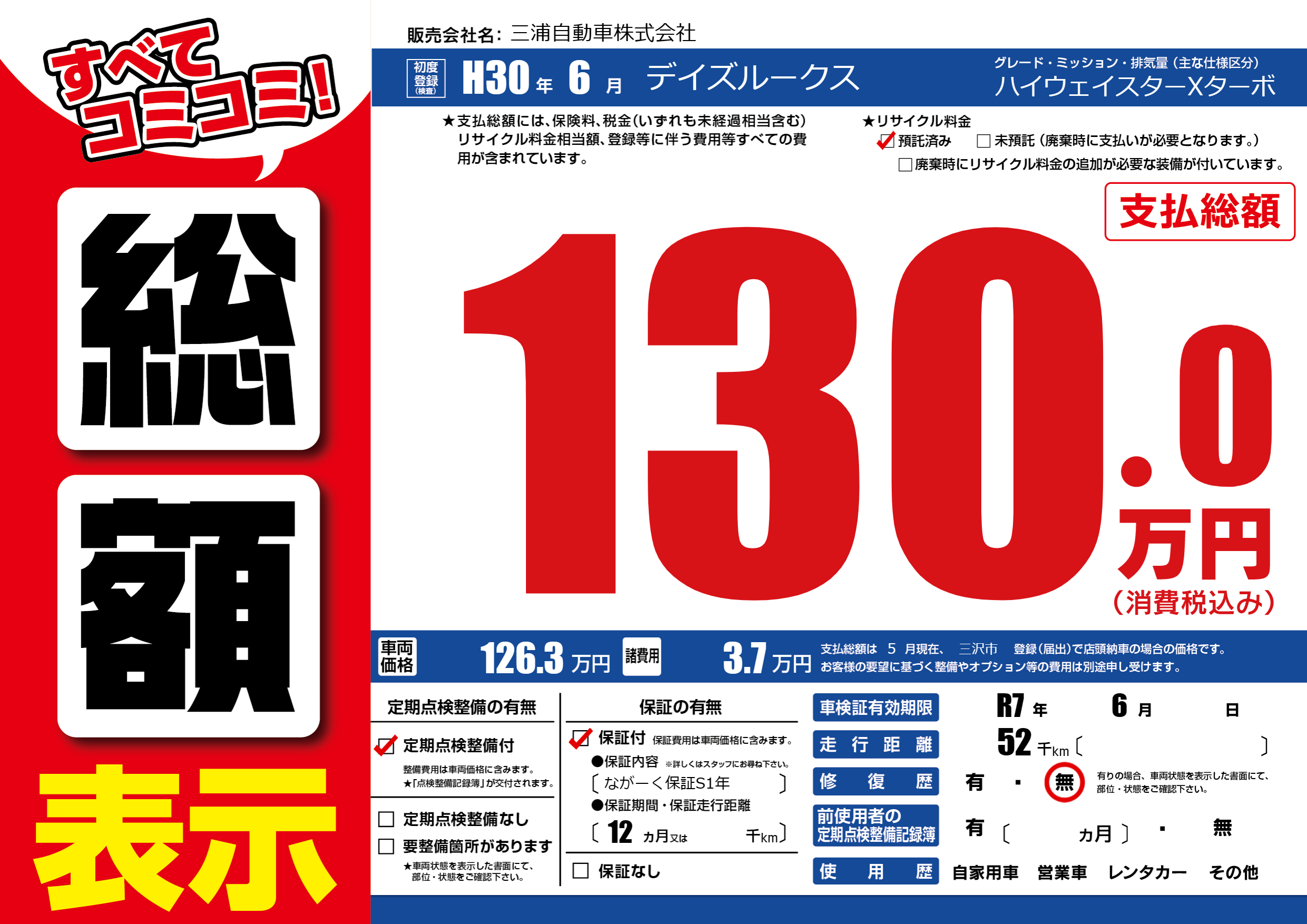 | 走行キロ | 5.2万km | 初年度登録 | H30年6月 |