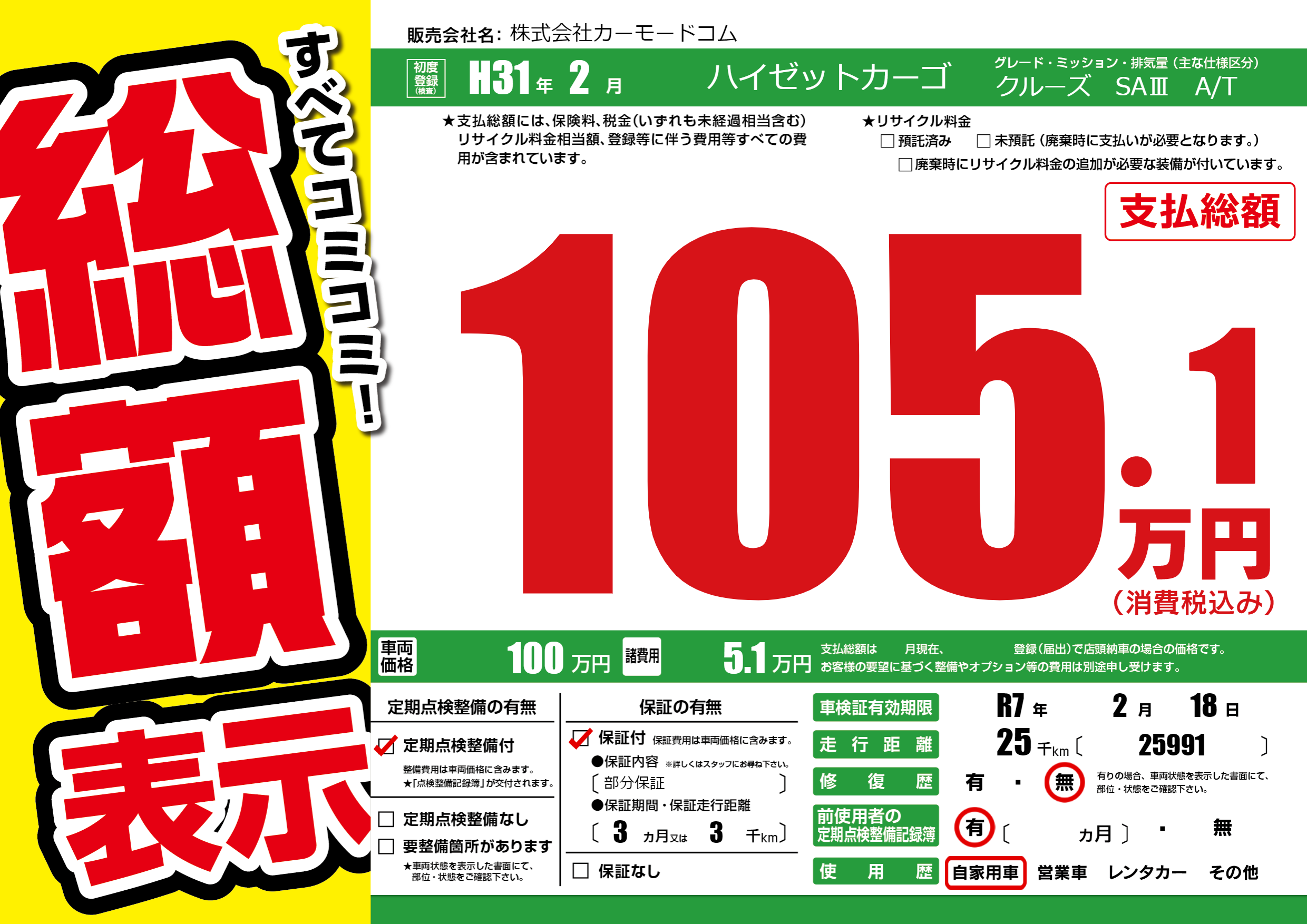 保証付き 保証内容(部分保証) 3ヶ月または(3)千kmまで |