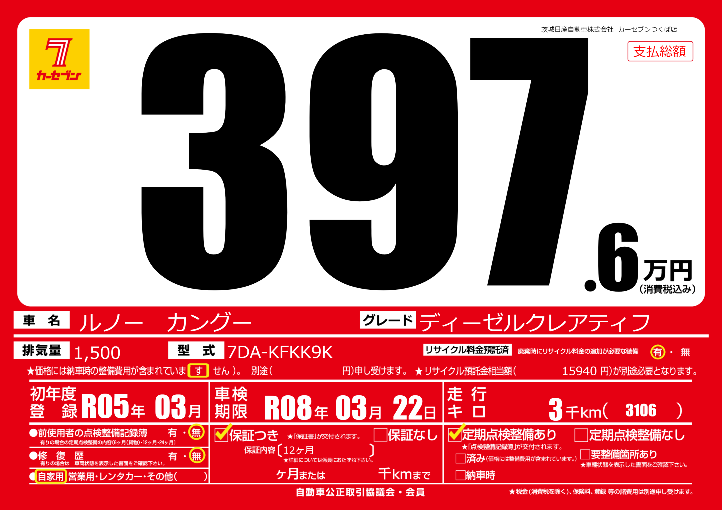 | 走行キロ | 0.3万km | 初年度登録 | R05年03月 |