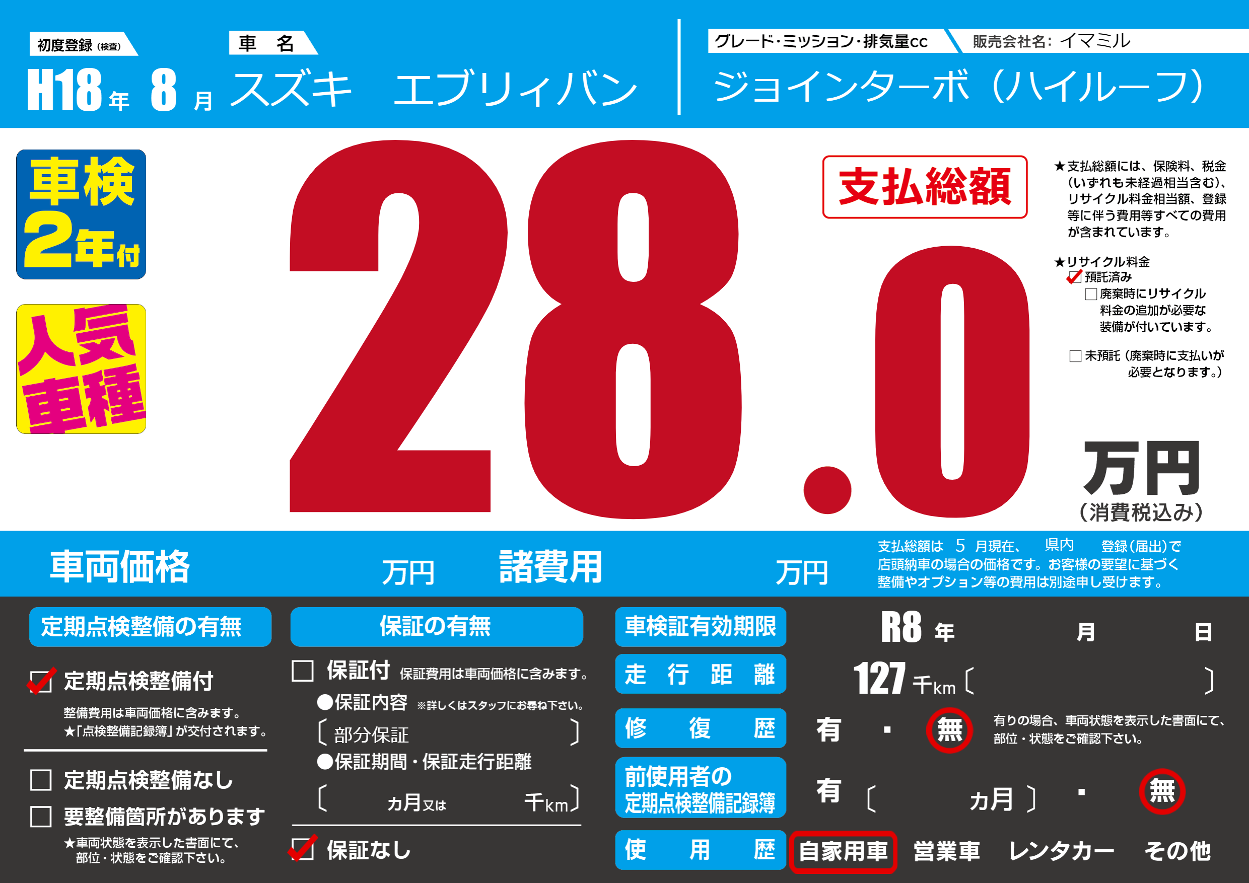 | 走行キロ | 12.7万km | 初年度登録 | H18年8月 |