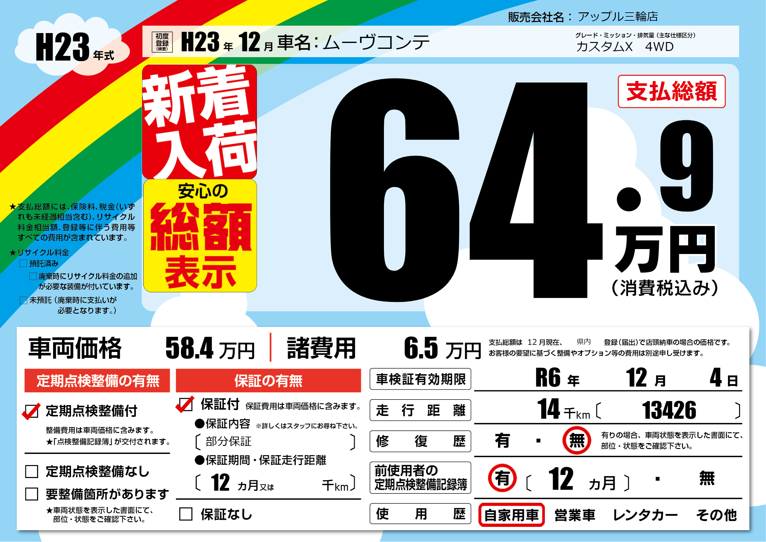 | 車名 | ムーヴコンテ | グレード ミッション 排気量 |
