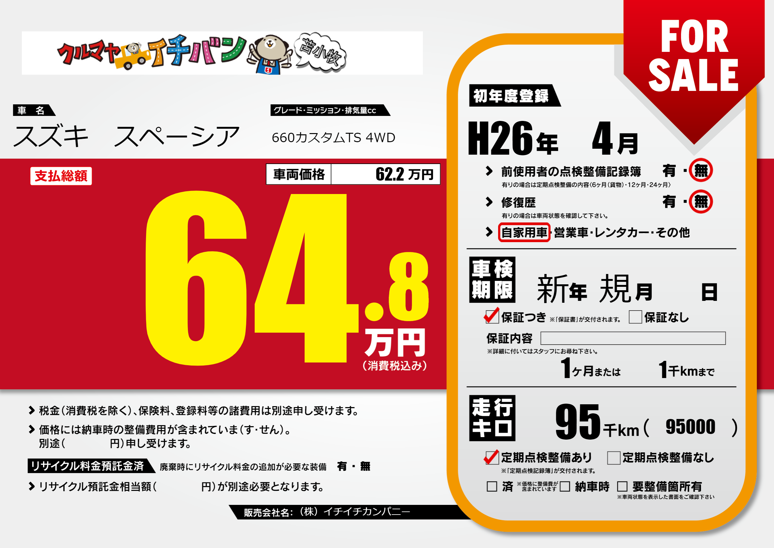 保証付き 保証内容(---) 1ヶ月または(1)千kmまで |
