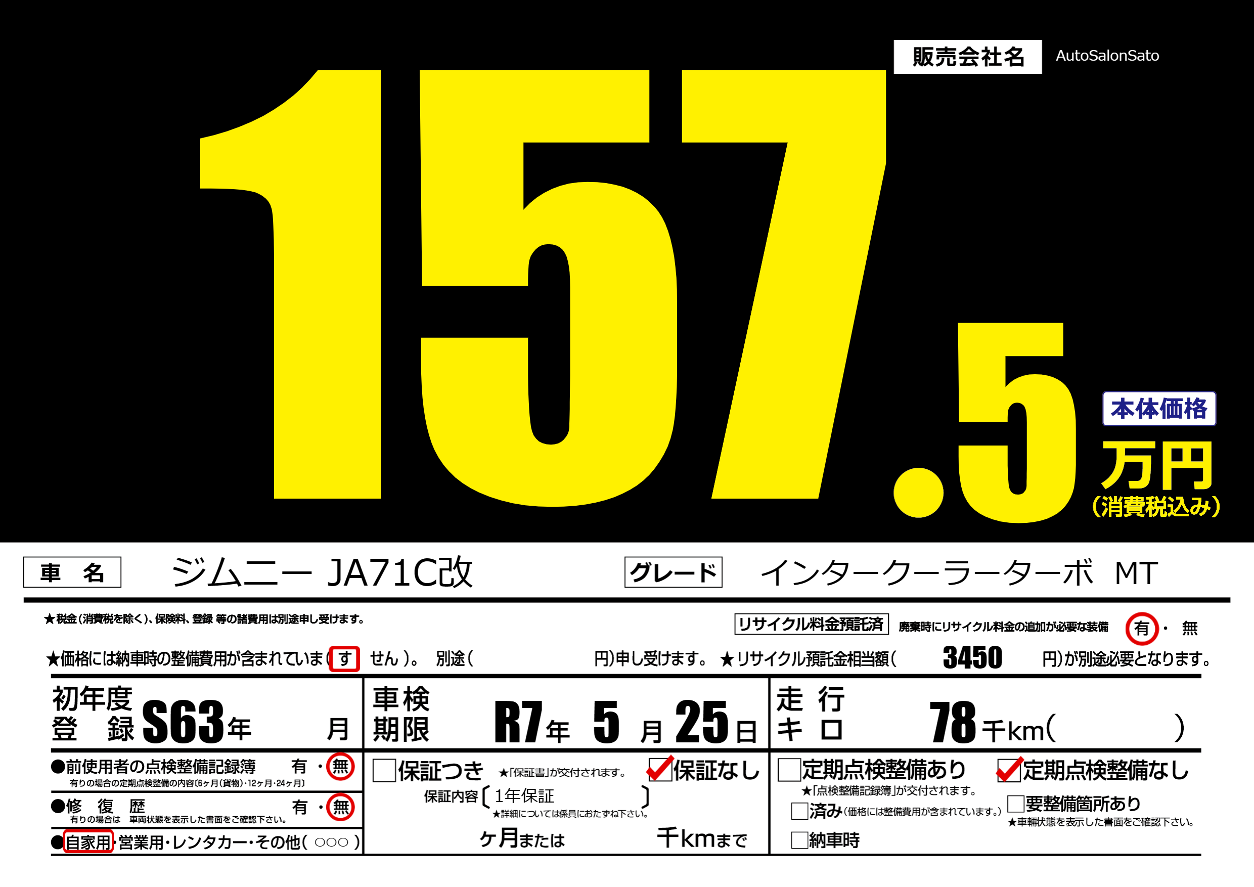 | 車名 | ジムニー JA71C改 | グレード ミッション 排気量 |