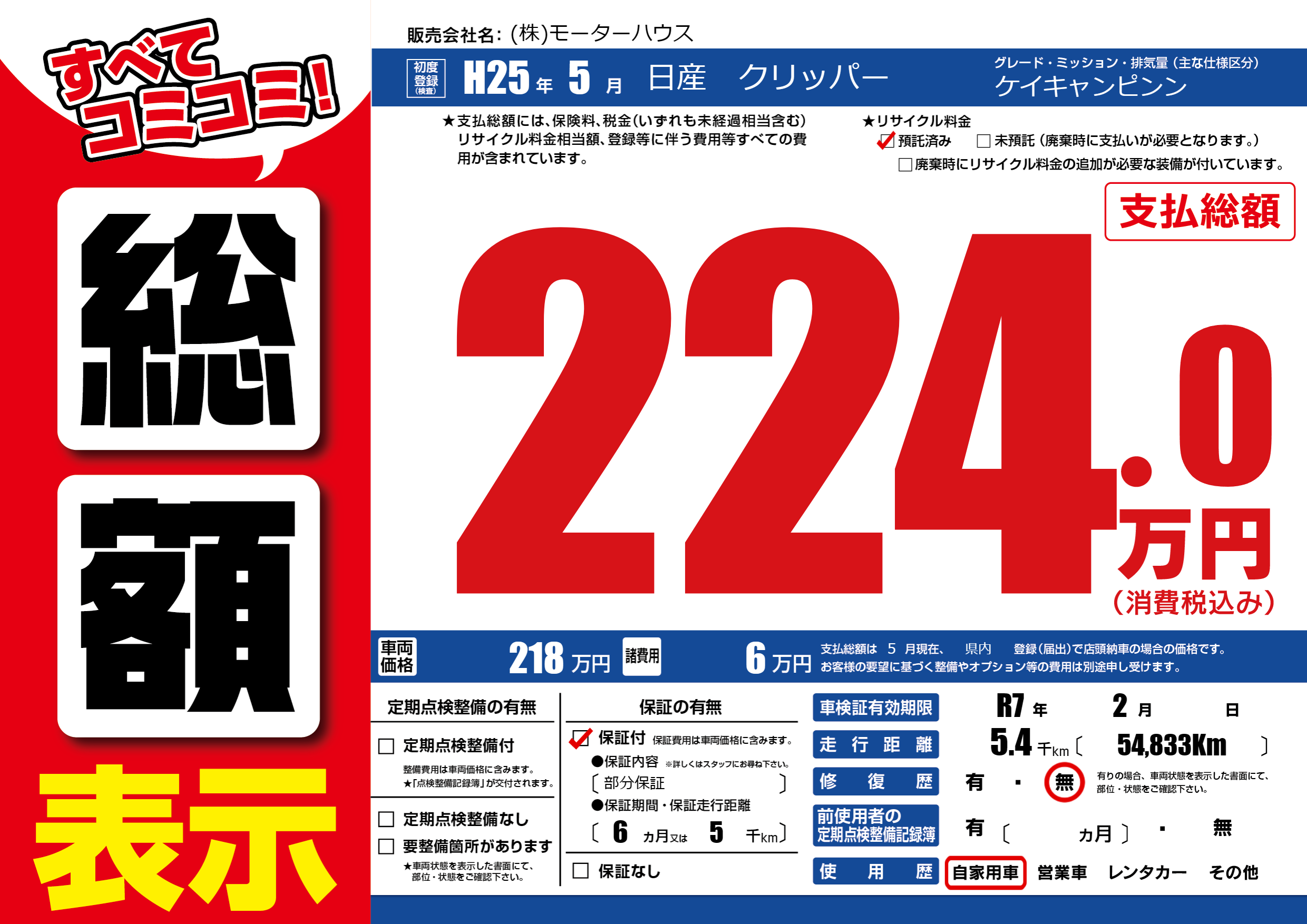 | 車名 | 日産 クリッパー | グレード ミッション 排気量 |