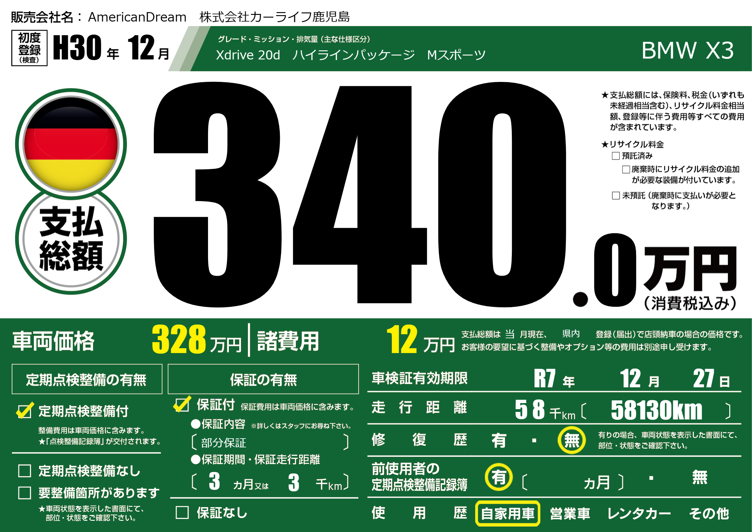 | 車名 | BMW X3 | グレード ミッション 排気量 |