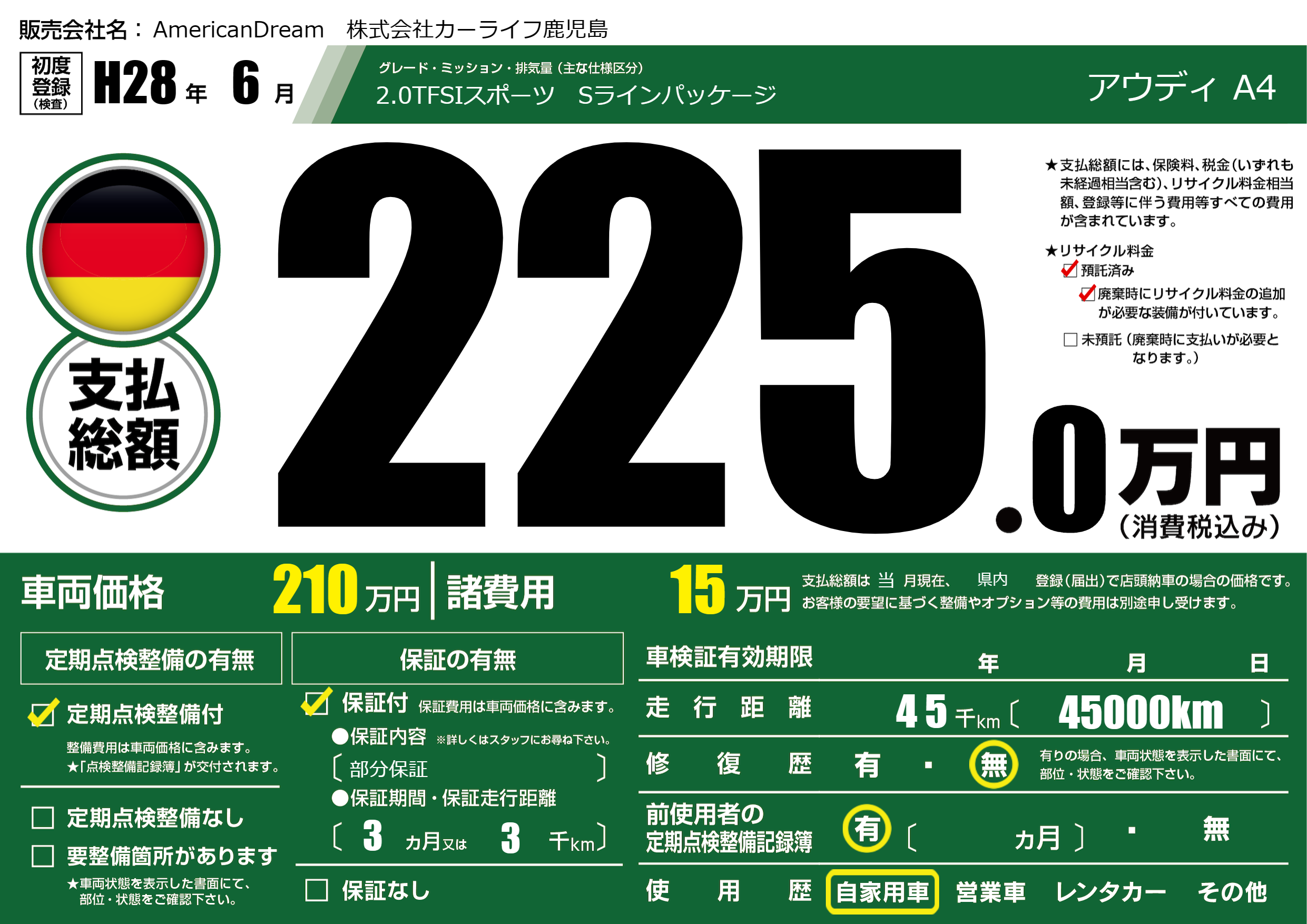 | 車名 | アウディ A4 | グレード ミッション 排気量 |
