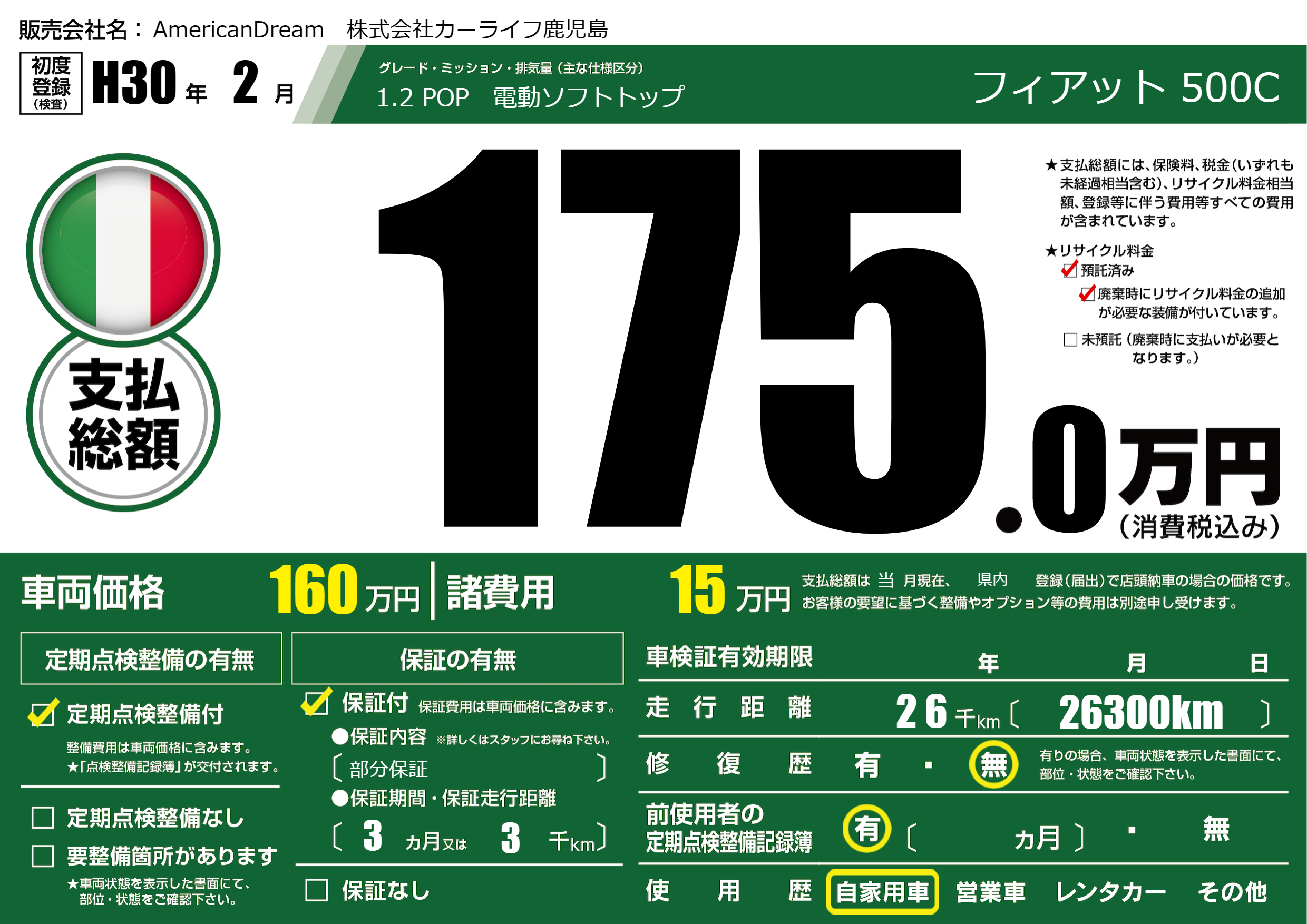 | 車名 | フィアット 500C | グレード ミッション 排気量 |