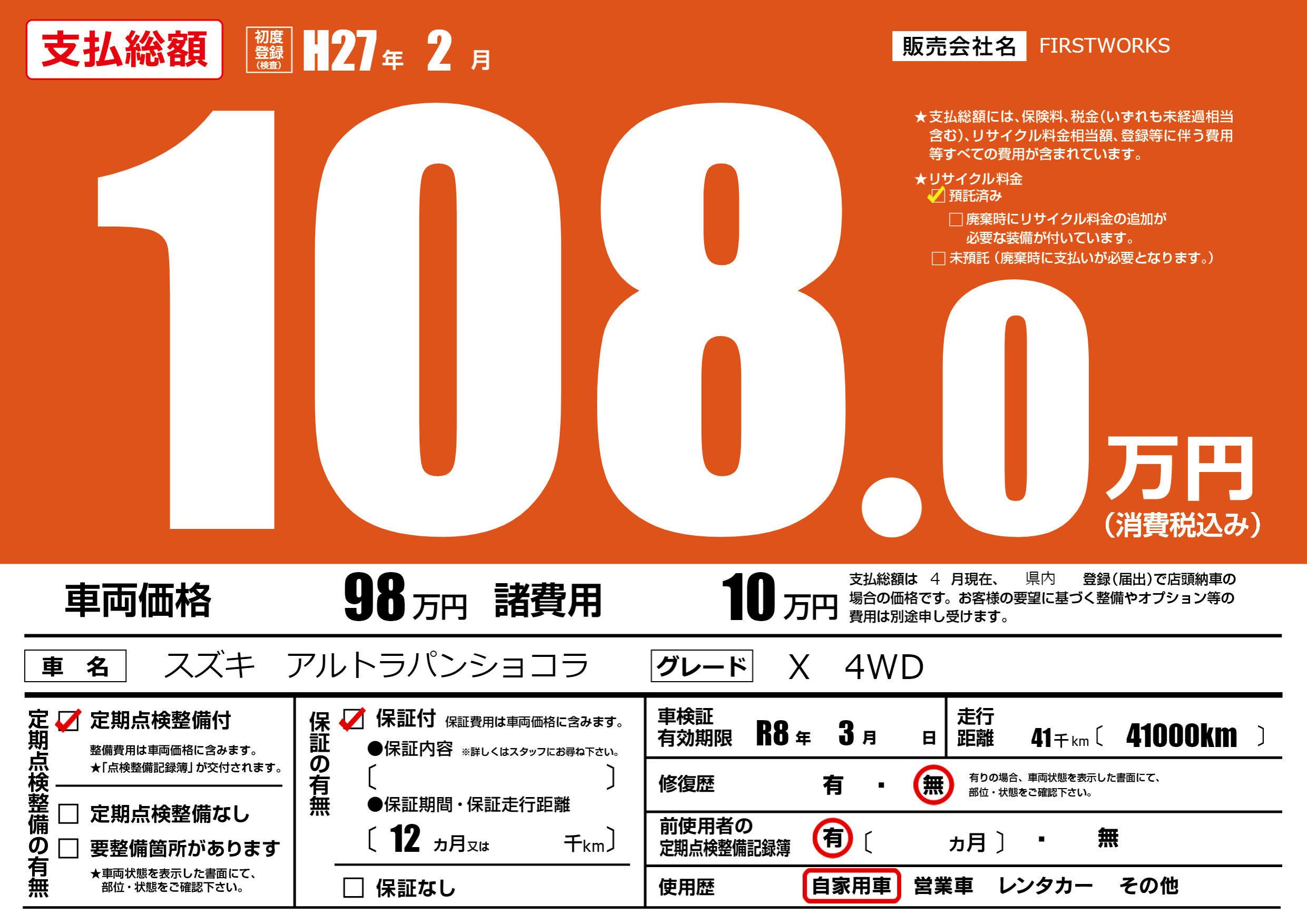 | 走行キロ | 4.1万km | 初年度登録 | H27年2月 |