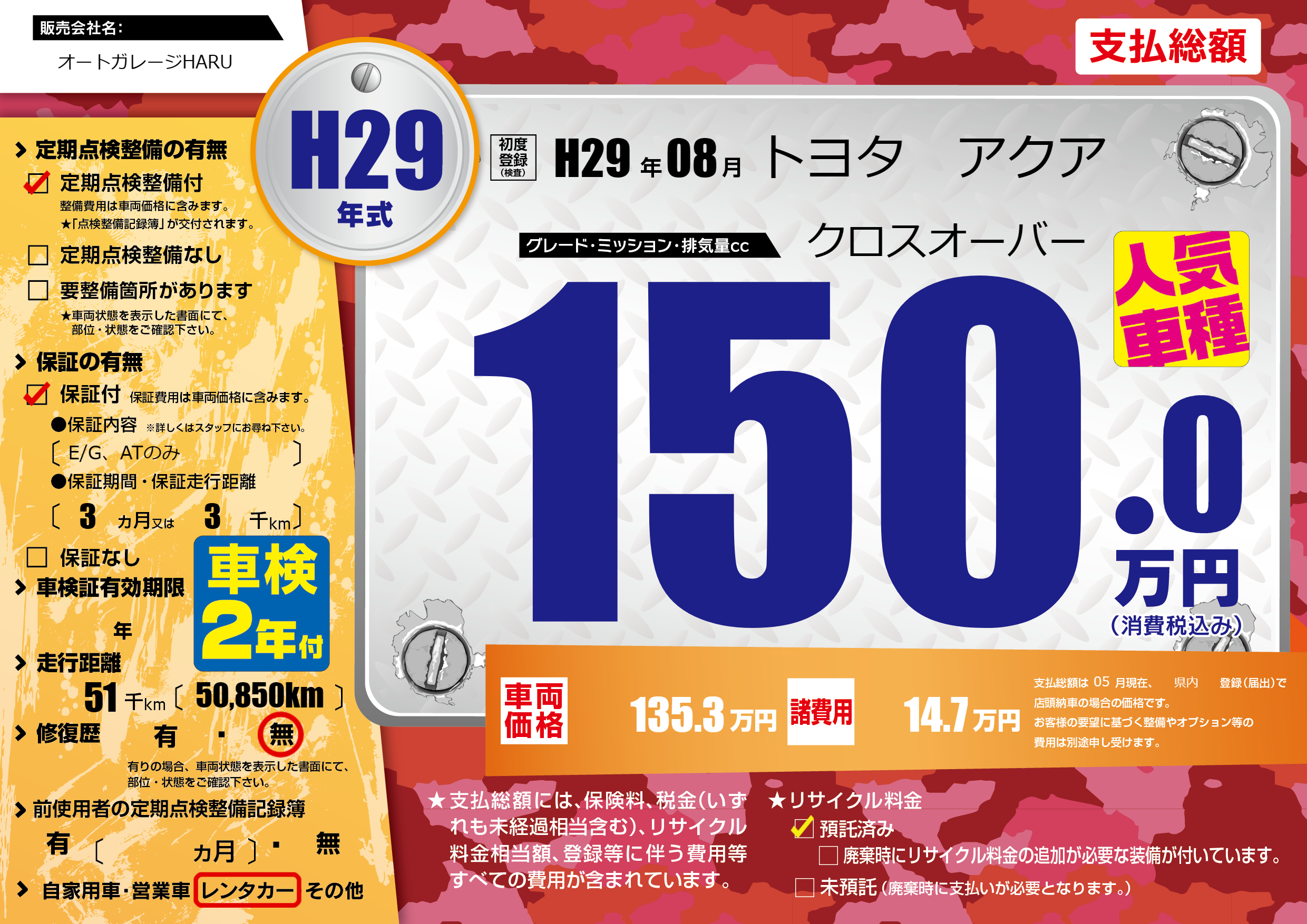| 走行キロ | 5.1万km | 初年度登録 | H29年08月 |