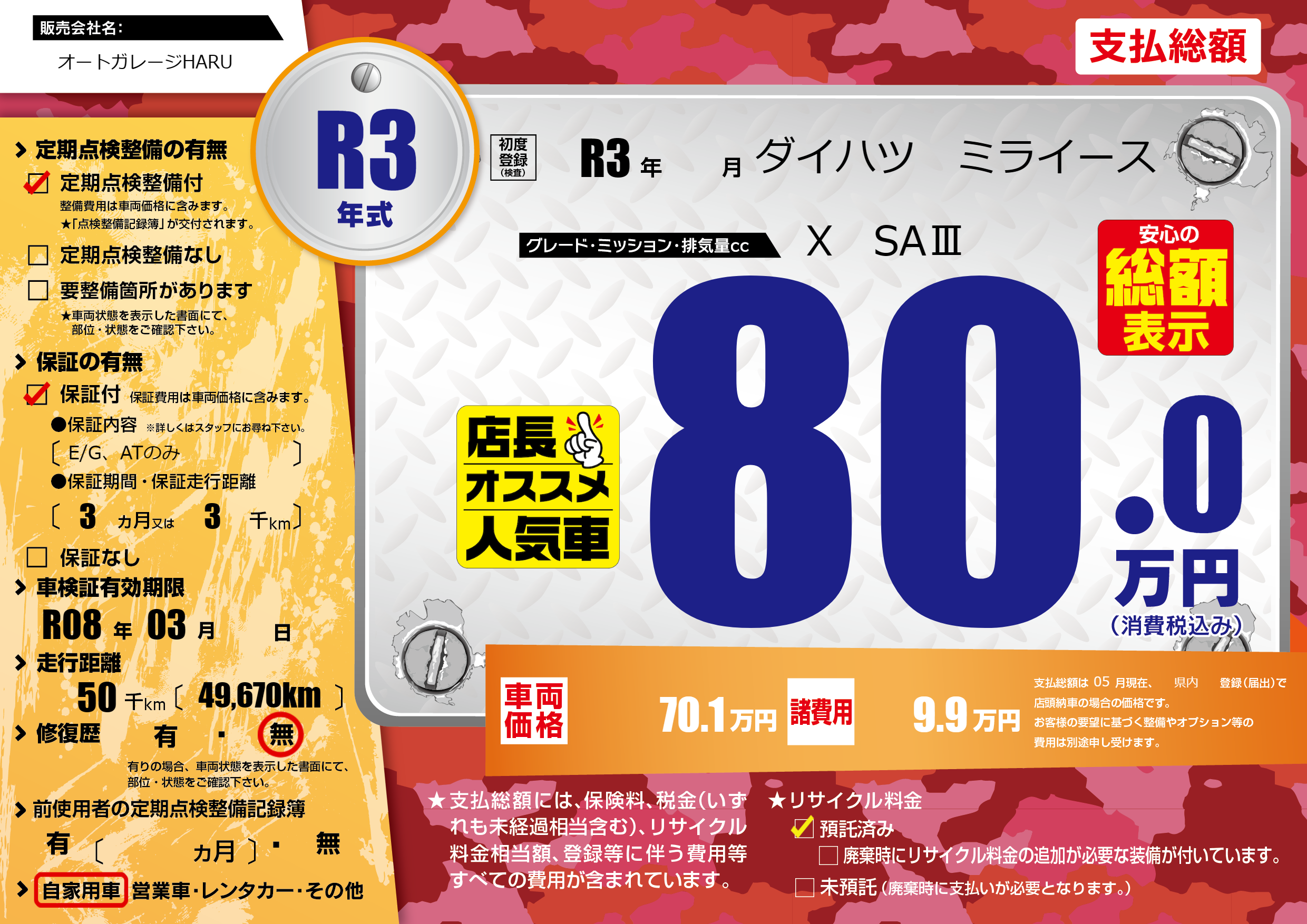 | 走行キロ | 5万km | 初年度登録 | R3年---月 |