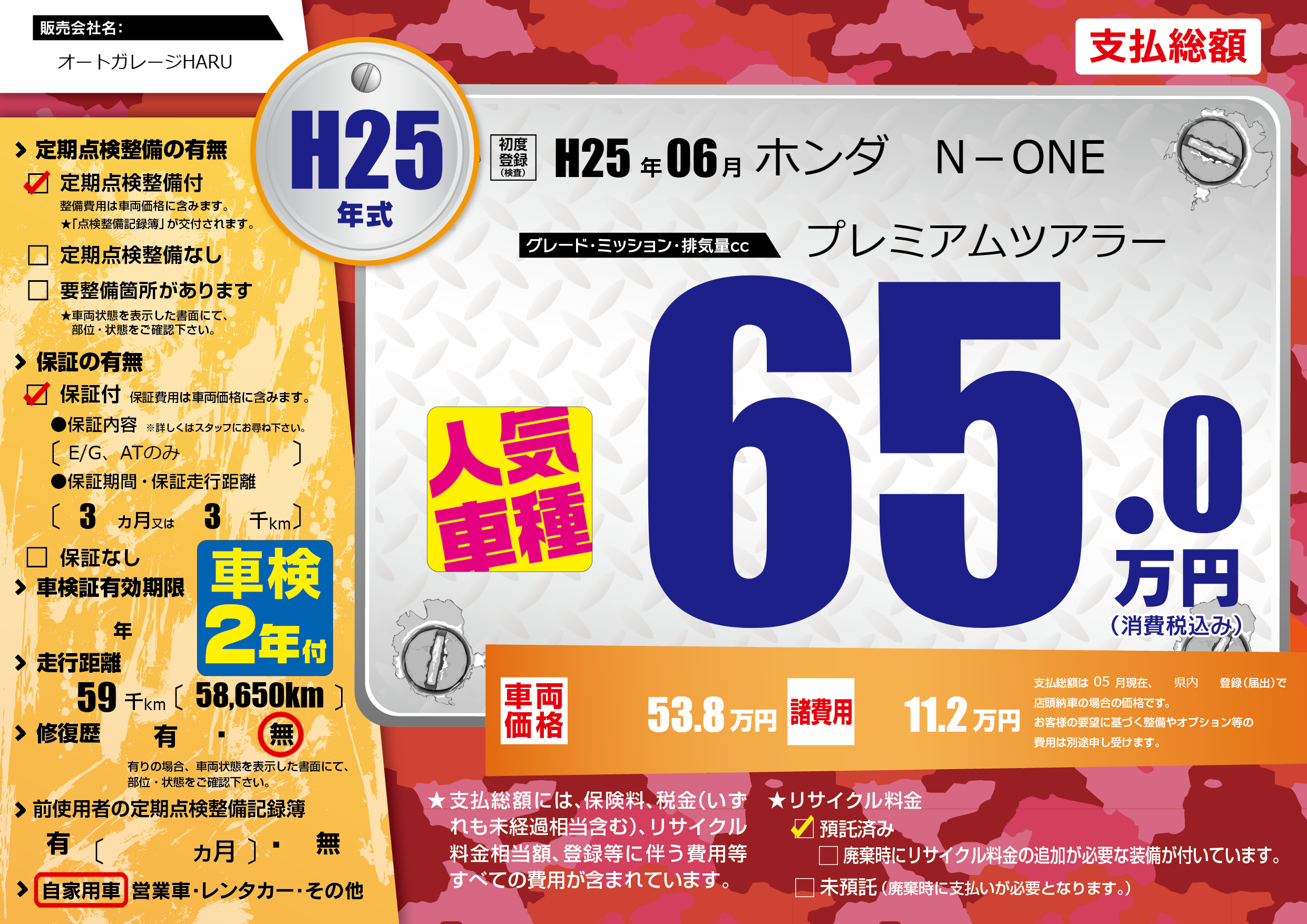 | 車名 | ホンダ N-ONE | グレード ミッション 排気量 |