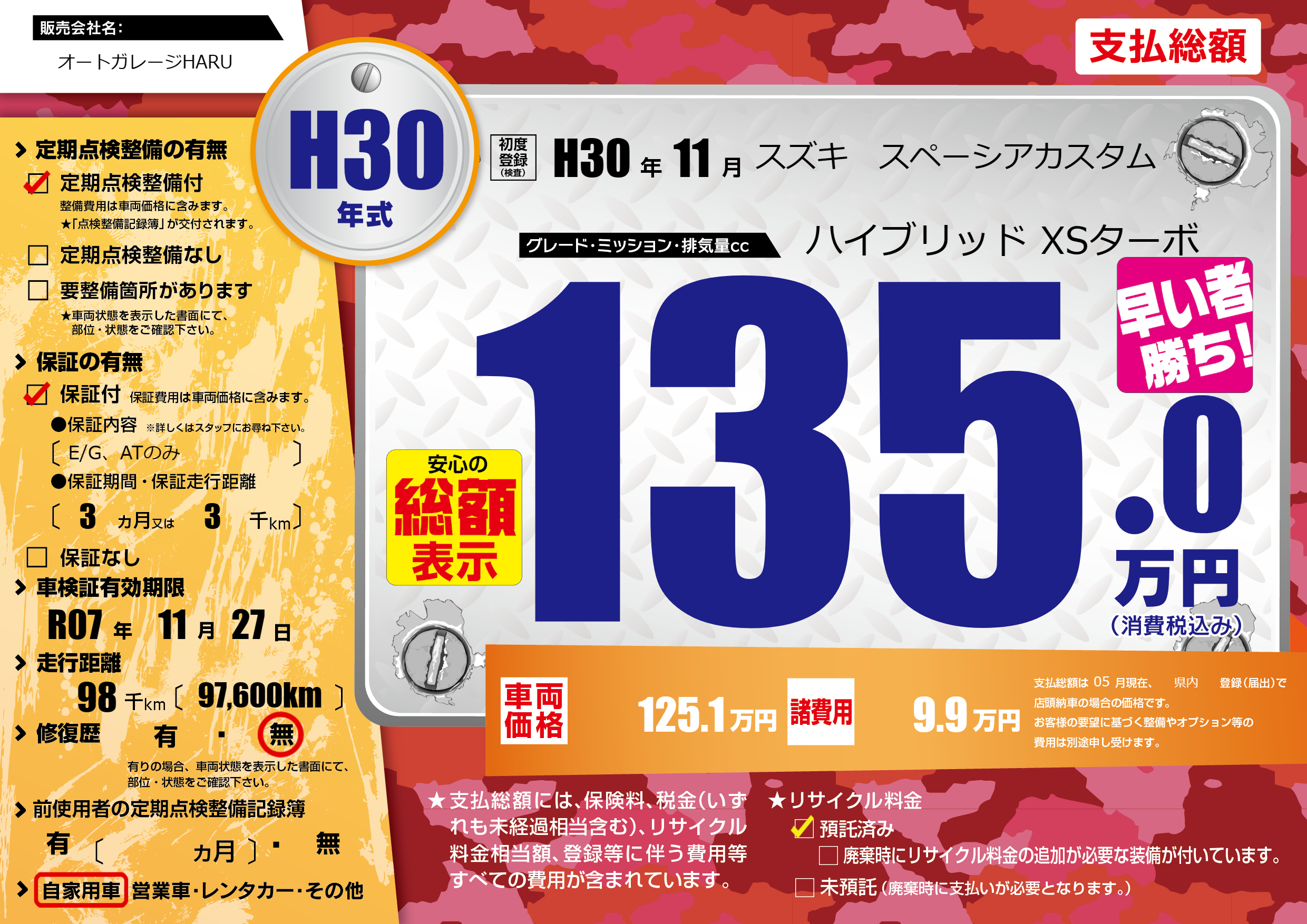 | 走行キロ | 9.8万km | 初年度登録 | H30年11月 |