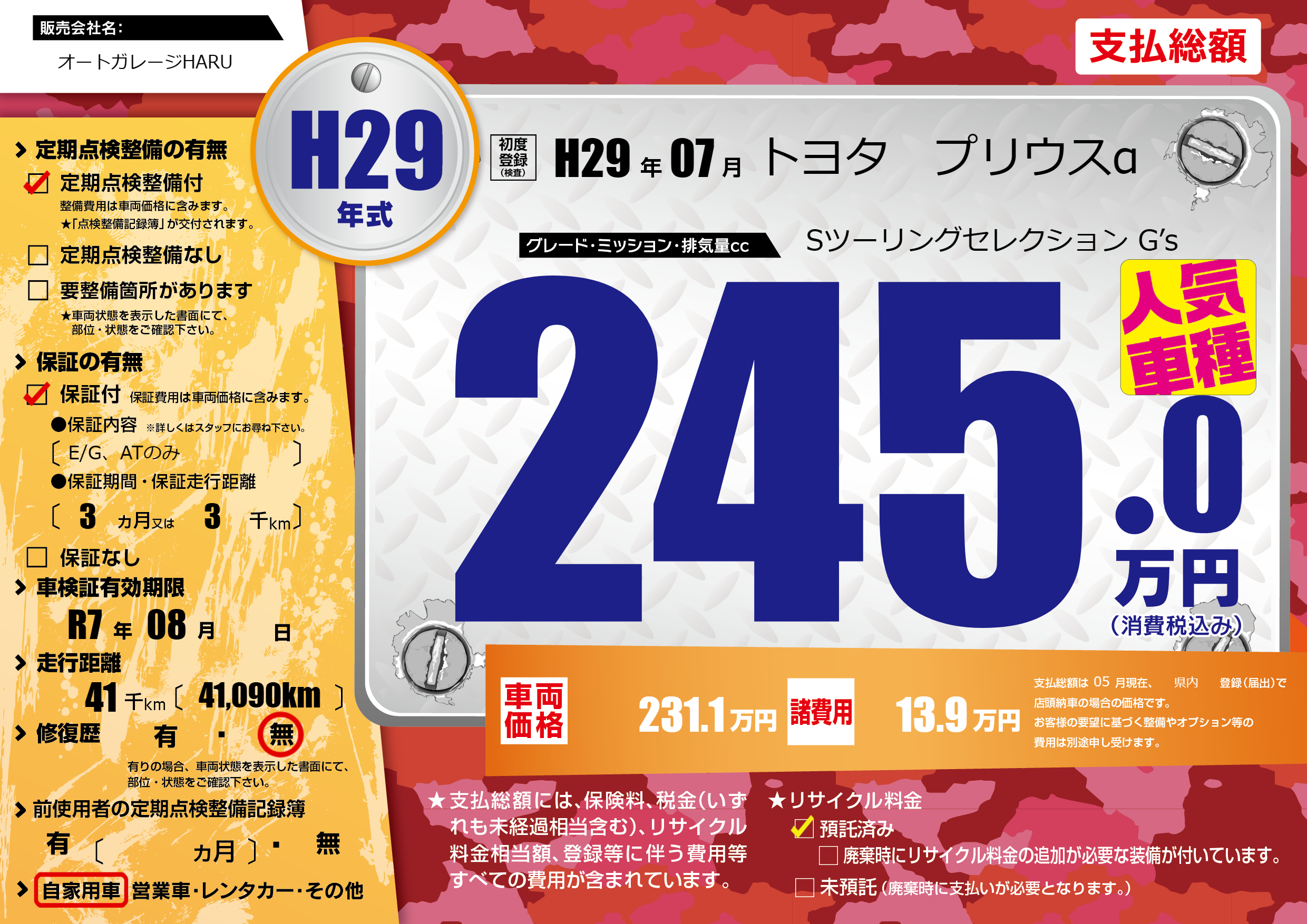 | 車名 | トヨタ プリウスα | グレード ミッション 排気量 |