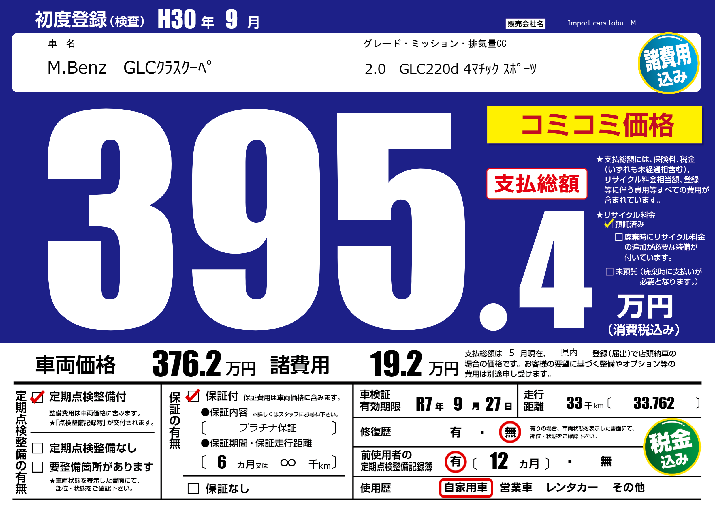 | 車名 | M.Benz GLCクラスクーペ | グレード ミッション 排気量 |