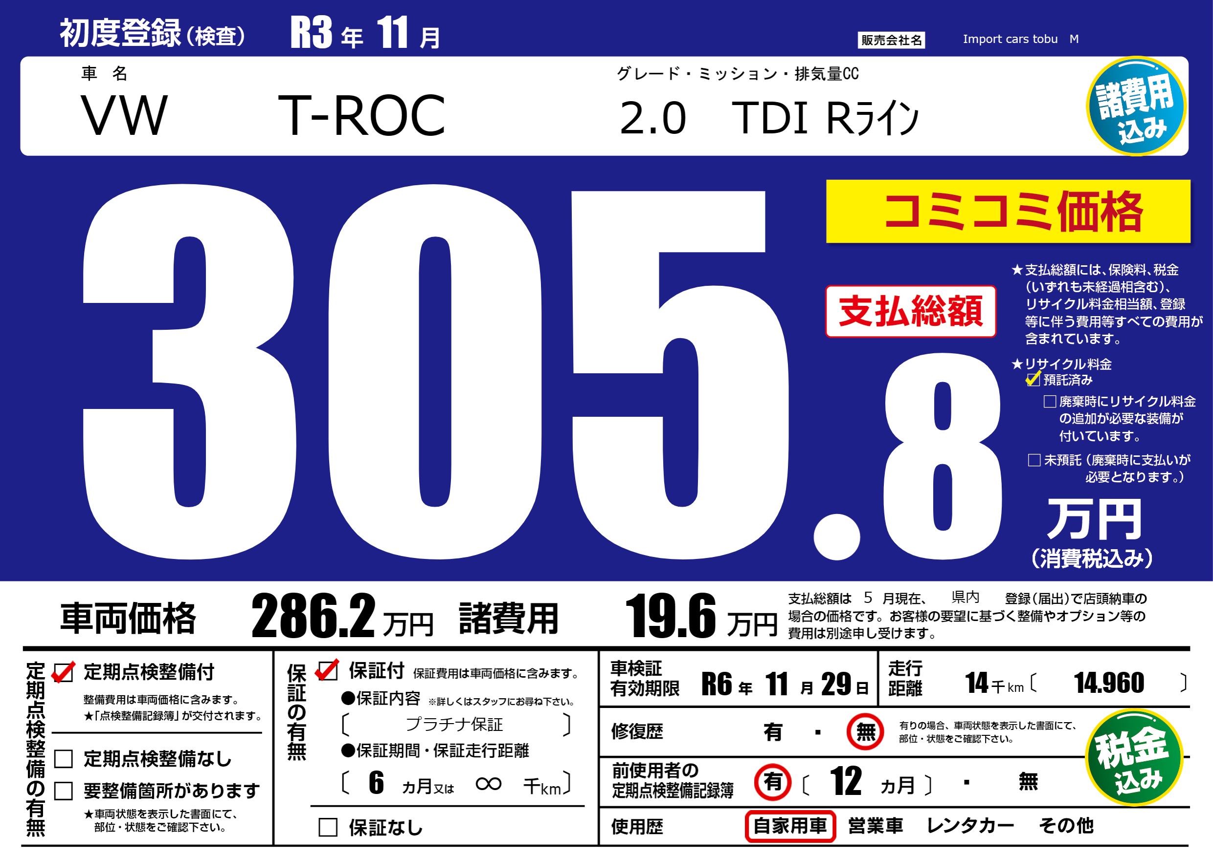 保証付き 保証内容( プラチナ保証) 6ヶ月または(∞)千kmまで |