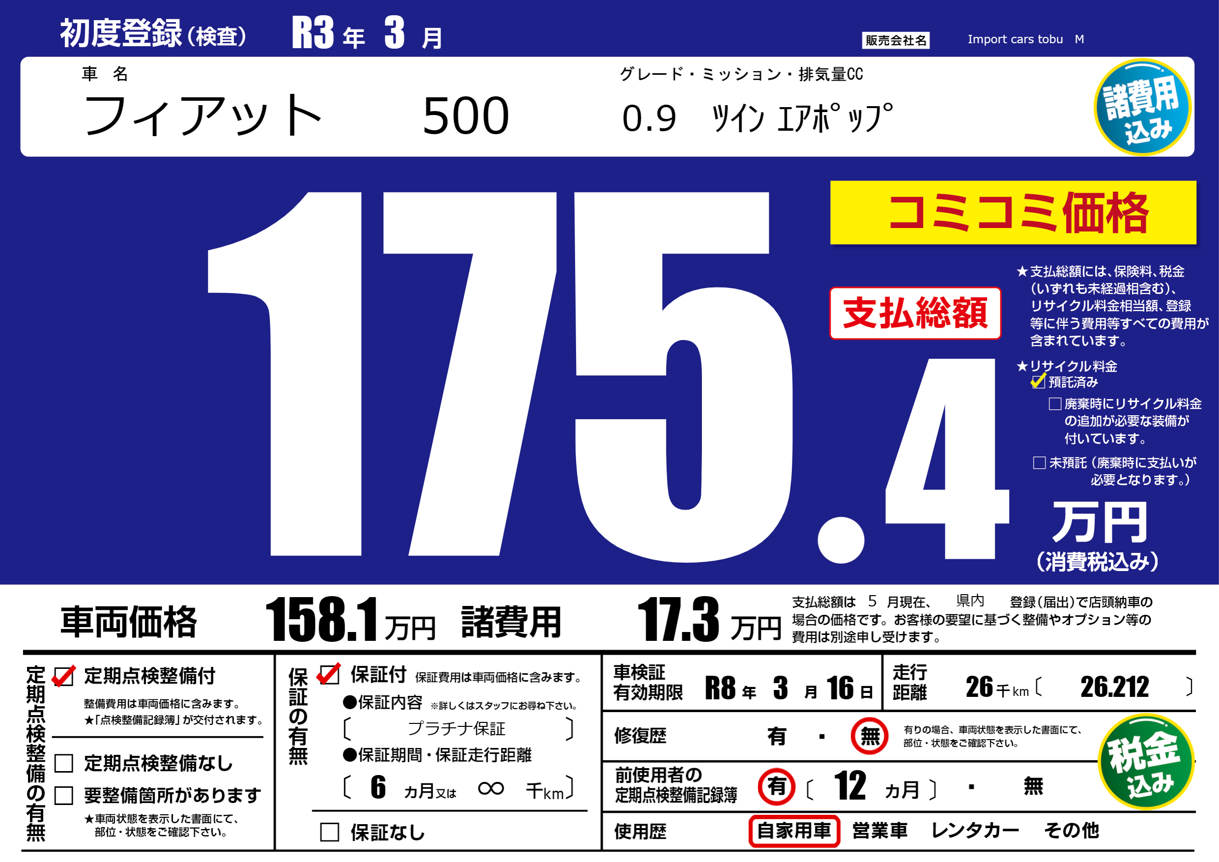 | 車名 | フィアット 500 | グレード ミッション 排気量 |