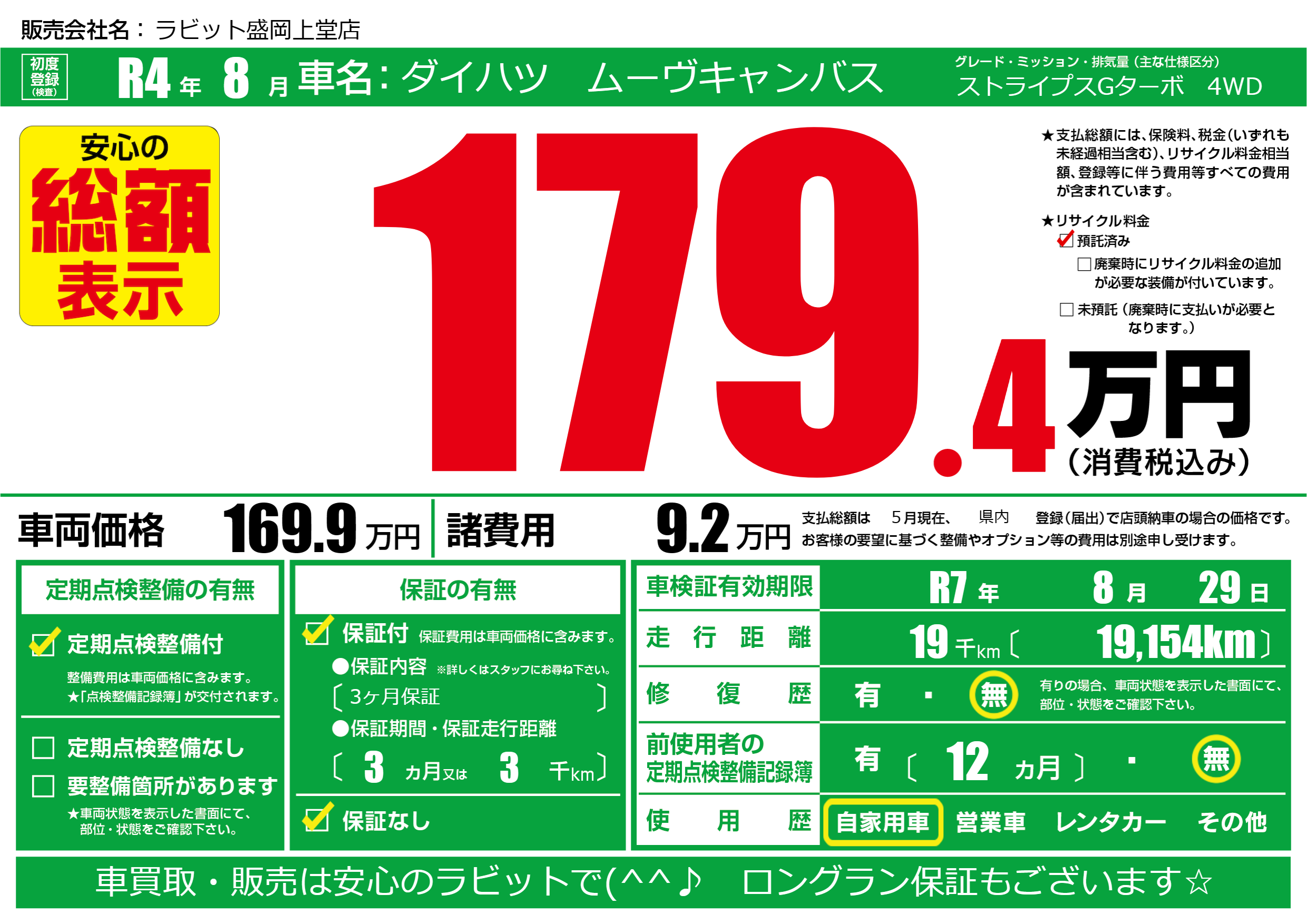 | 走行キロ | 1.9万km | 初年度登録 | R4年8月 |