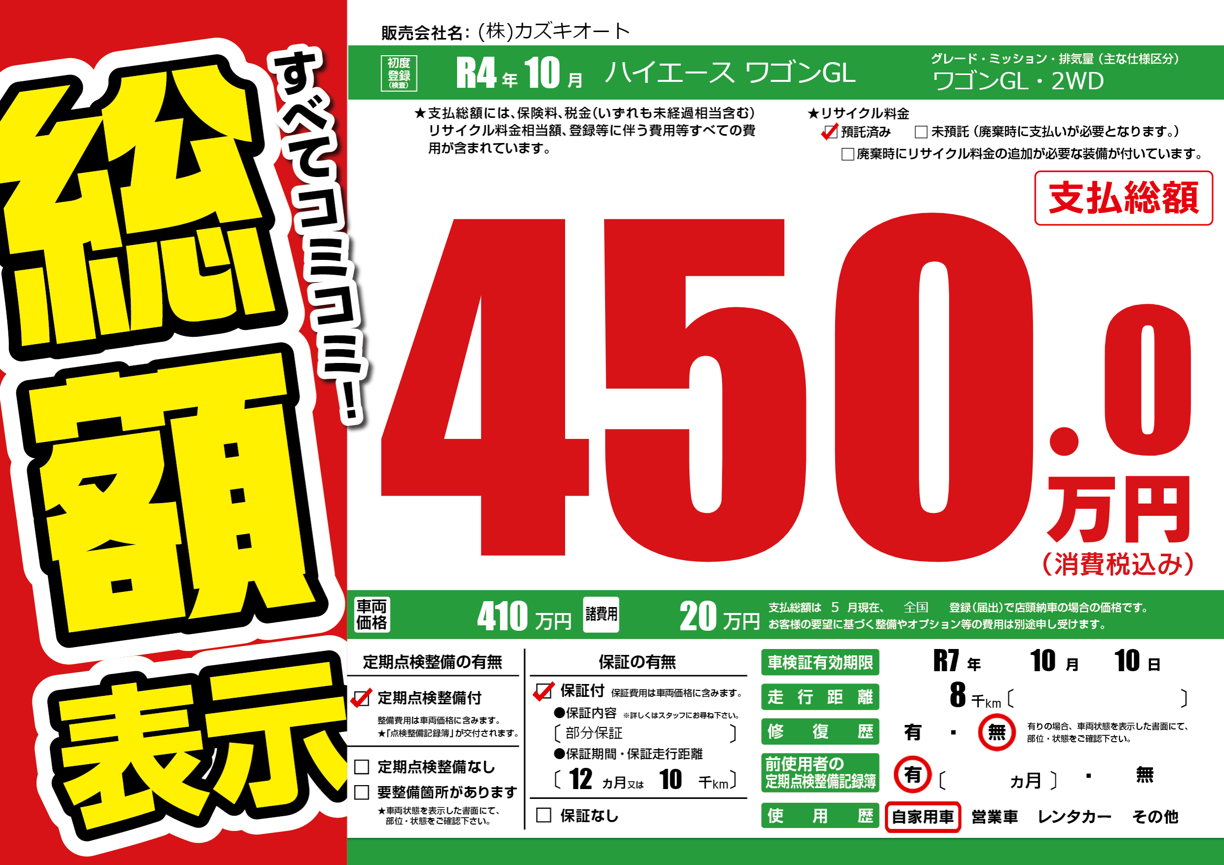 | 走行キロ | 0.8万km | 初年度登録 | R4年10月 |